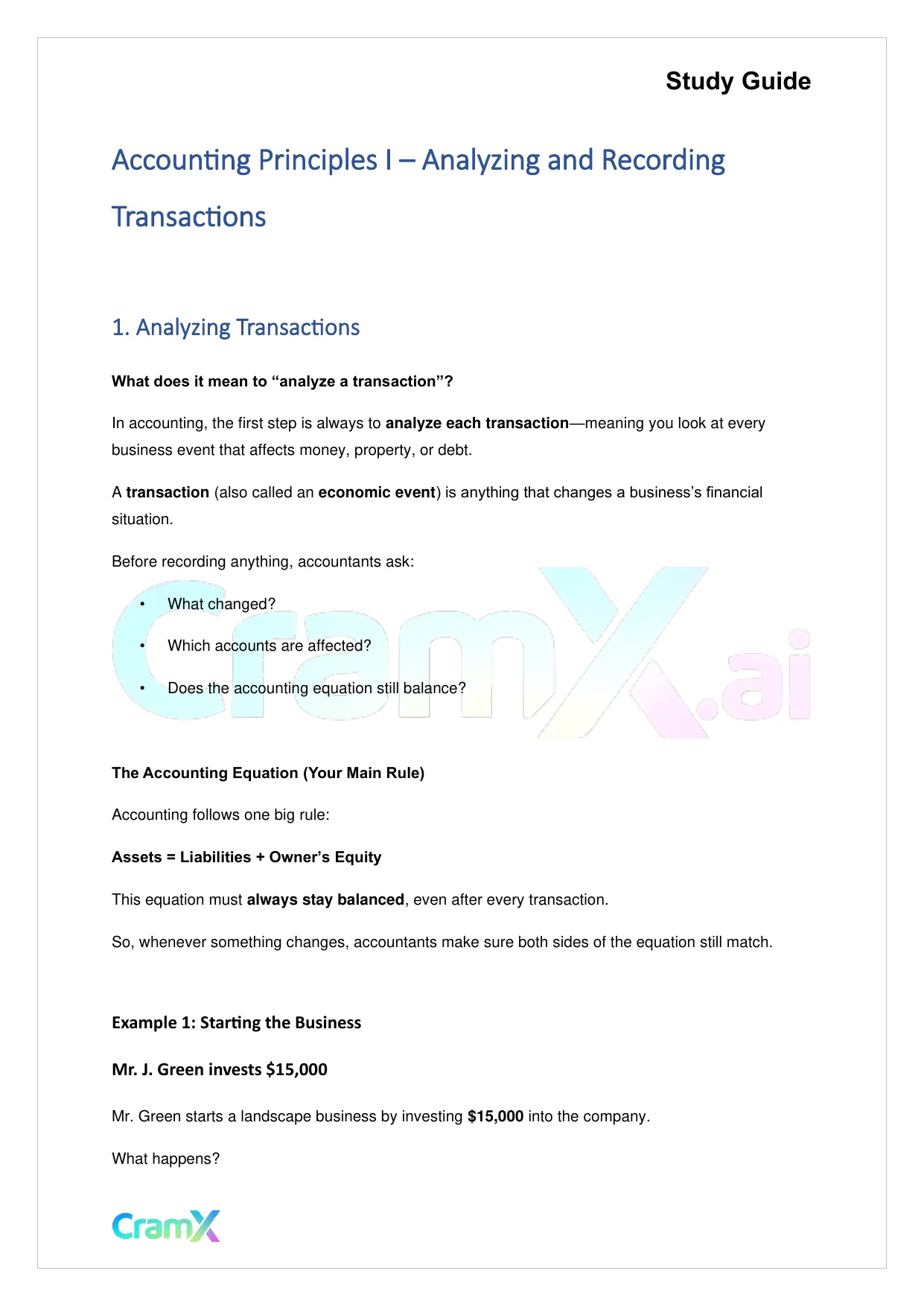 This document provides study materials related to Accounting Principles I – Analyzing and Recording Transactions. It may include explanations, summarized notes, examples, or practice questions designed to help students understand key concepts and review important topics covered in their coursework.