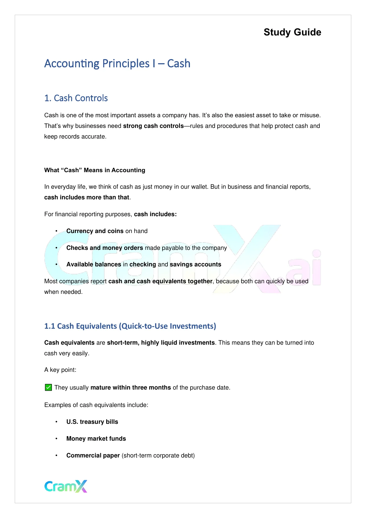 This document provides study materials related to Accounting Principles I – Cash. It may include explanations, summarized notes, examples, or practice questions designed to help students understand key concepts and review important topics covered in their coursework.
