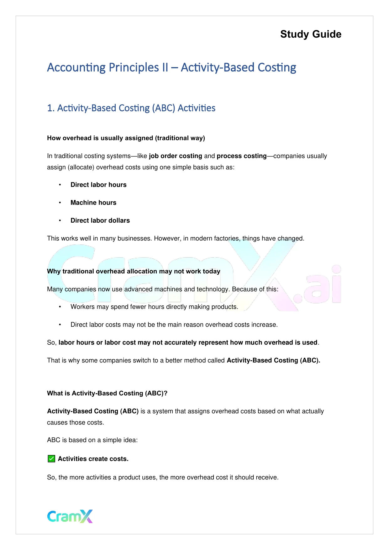 This document provides study materials related to Accounting Principles II – Activity-Based Costing. It may include explanations, summarized notes, examples, or practice questions designed to help students understand key concepts and review important topics covered in their coursework.