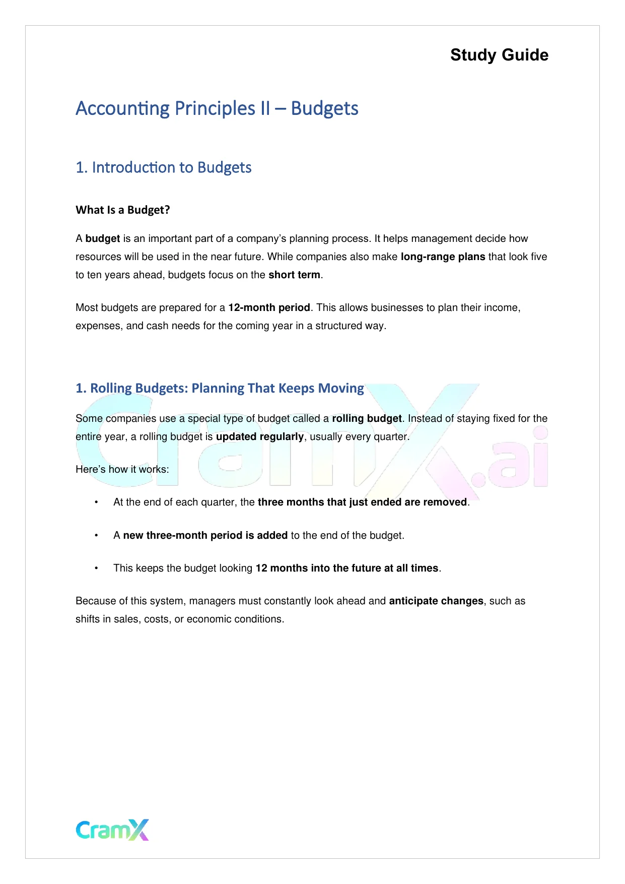 This document provides study materials related to Accounting Principles II – Budgets. It may include explanations, summarized notes, examples, or practice questions designed to help students understand key concepts and review important topics covered in their coursework.