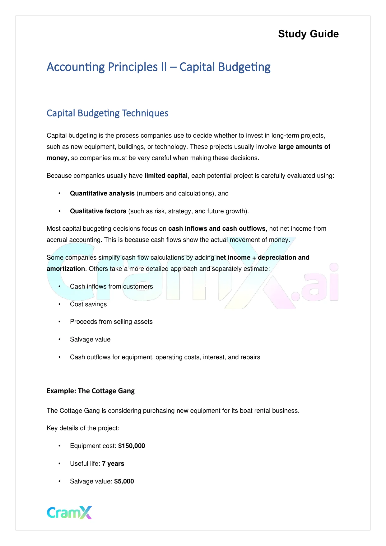 This document provides study materials related to Accounting Principles II – Capital Budgeting. It may include explanations, summarized notes, examples, or practice questions designed to help students understand key concepts and review important topics covered in their coursework.