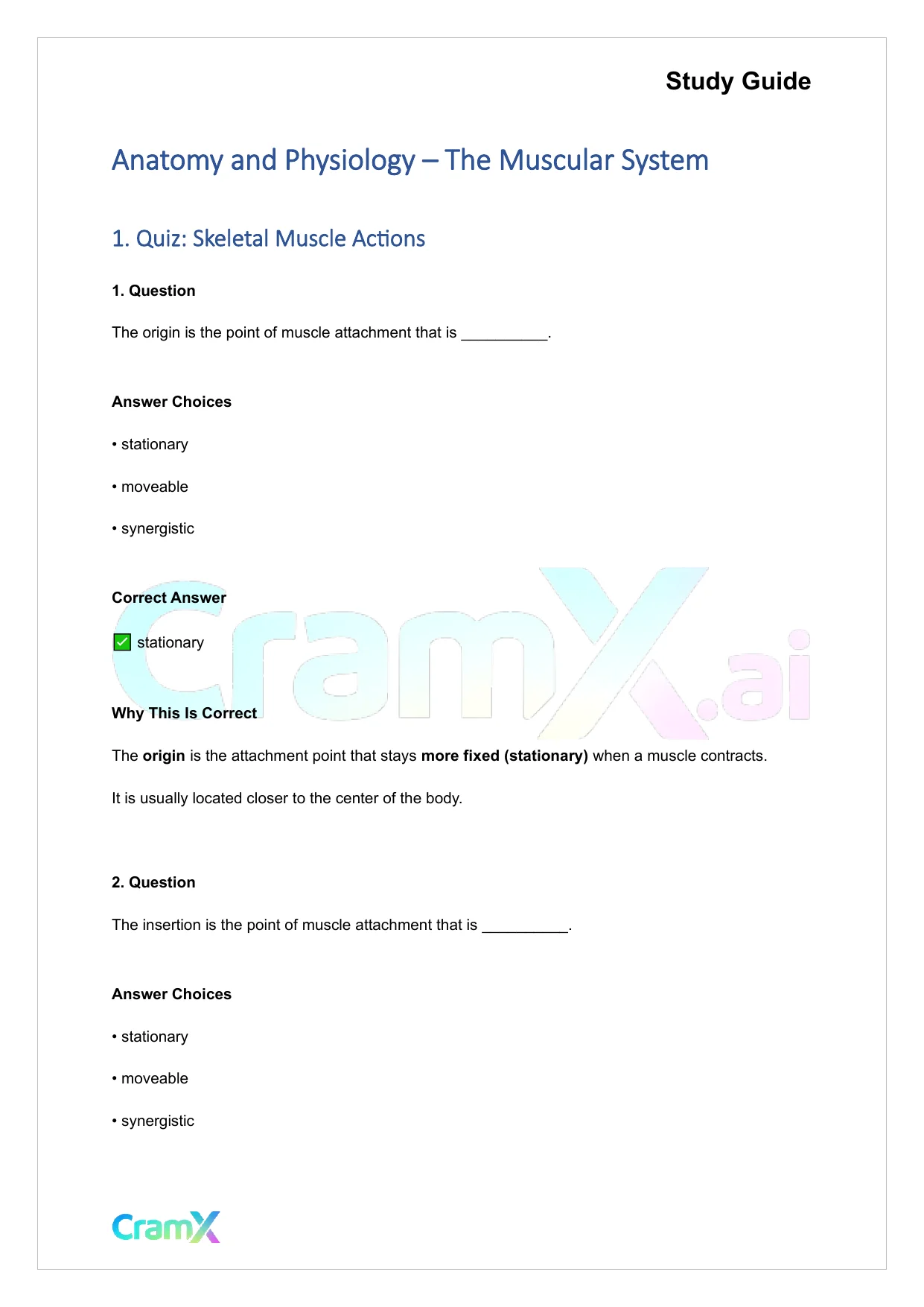 Students studying Anatomy and Physiology or related courses can use this material as a reference when preparing for assignments, exams, or classroom discussions. Resources on CramX may include study notes, exam guides, solutions, lecture summaries, and other academic learning materials.