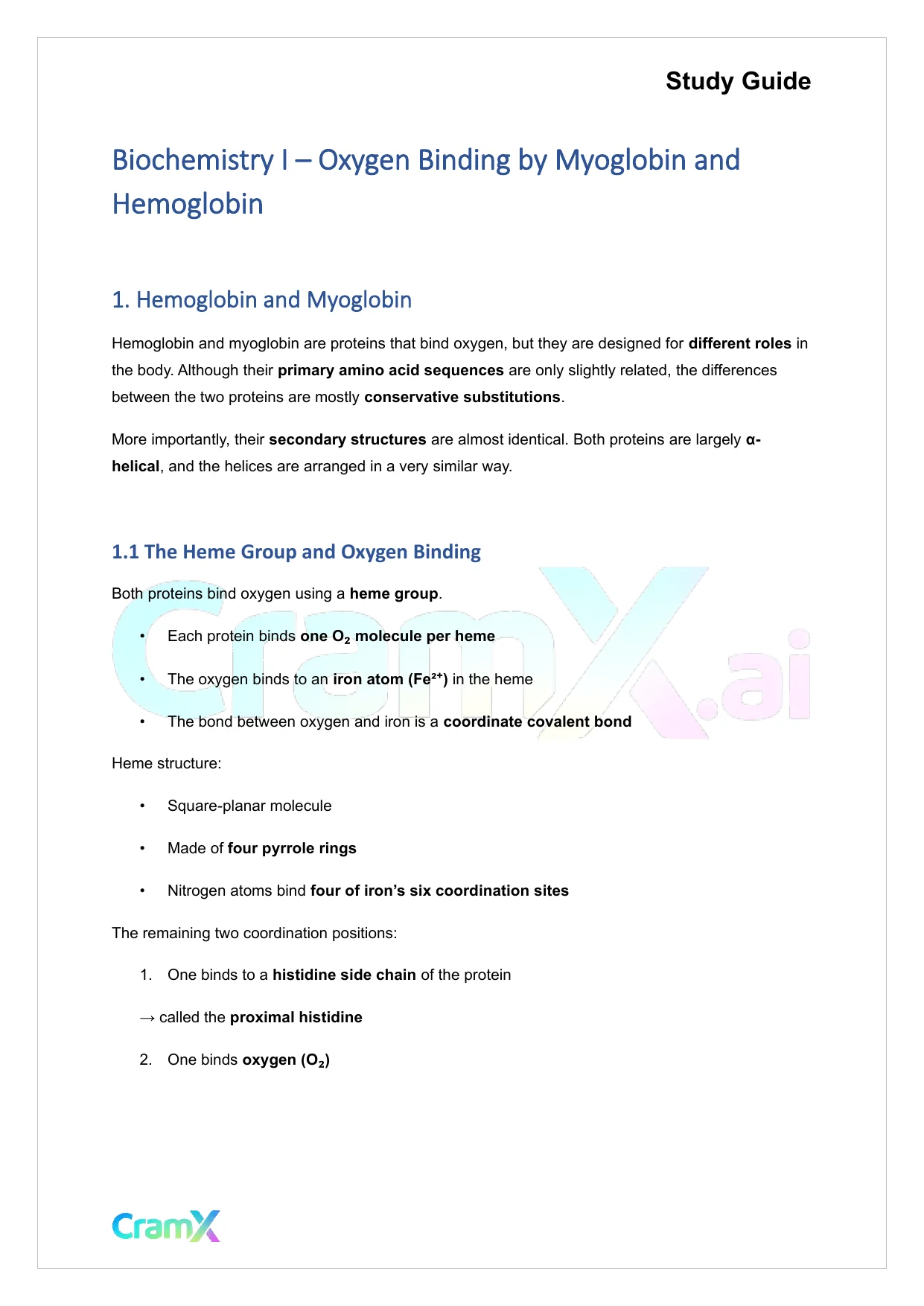 This document provides study materials related to Biochemistry I - Oxygen Binding by Myoglobin and Hemoglobin. It may include explanations, summarized notes, examples, or practice questions designed to help students understand key concepts and review important topics covered in their coursework.
