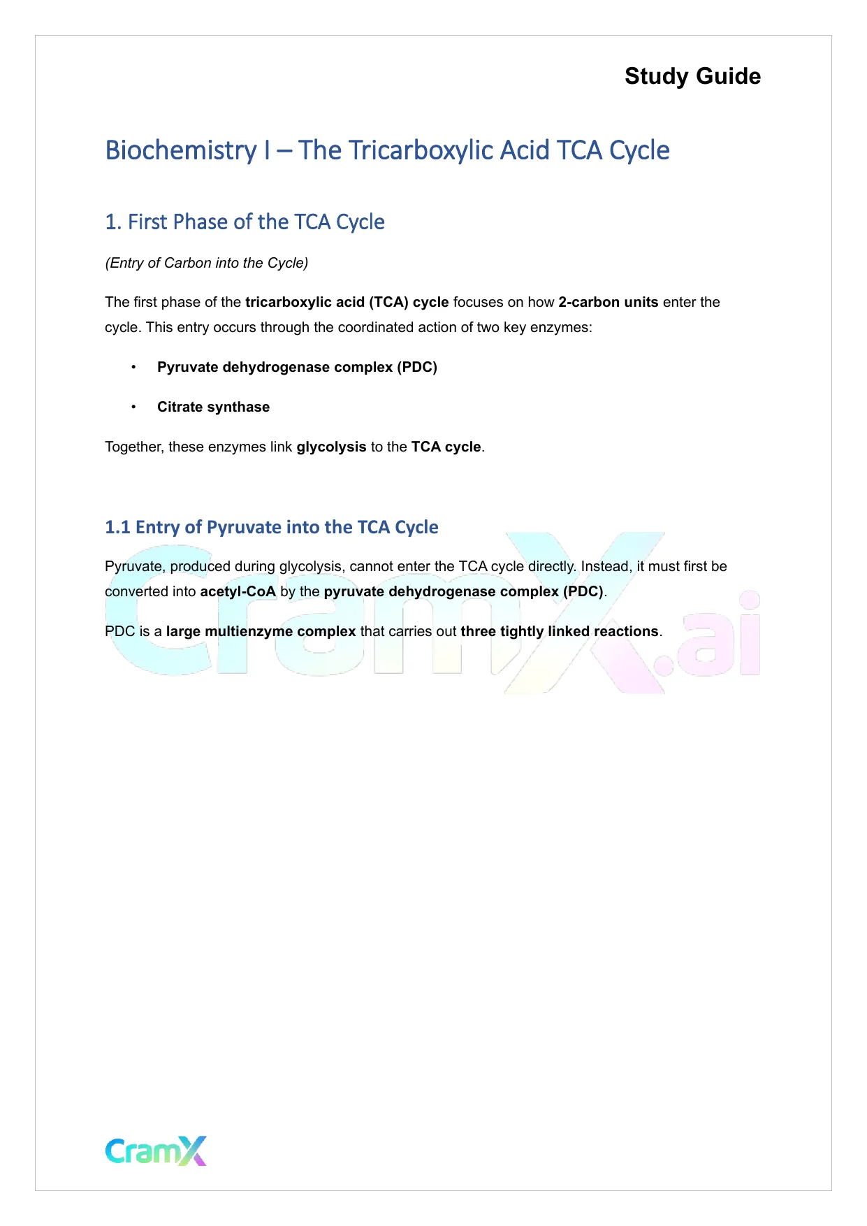 This document provides study materials related to Biochemistry I - The Tricarboxylic Acid TCA Cycle. It may include explanations, summarized notes, examples, or practice questions designed to help students understand key concepts and review important topics covered in their coursework.