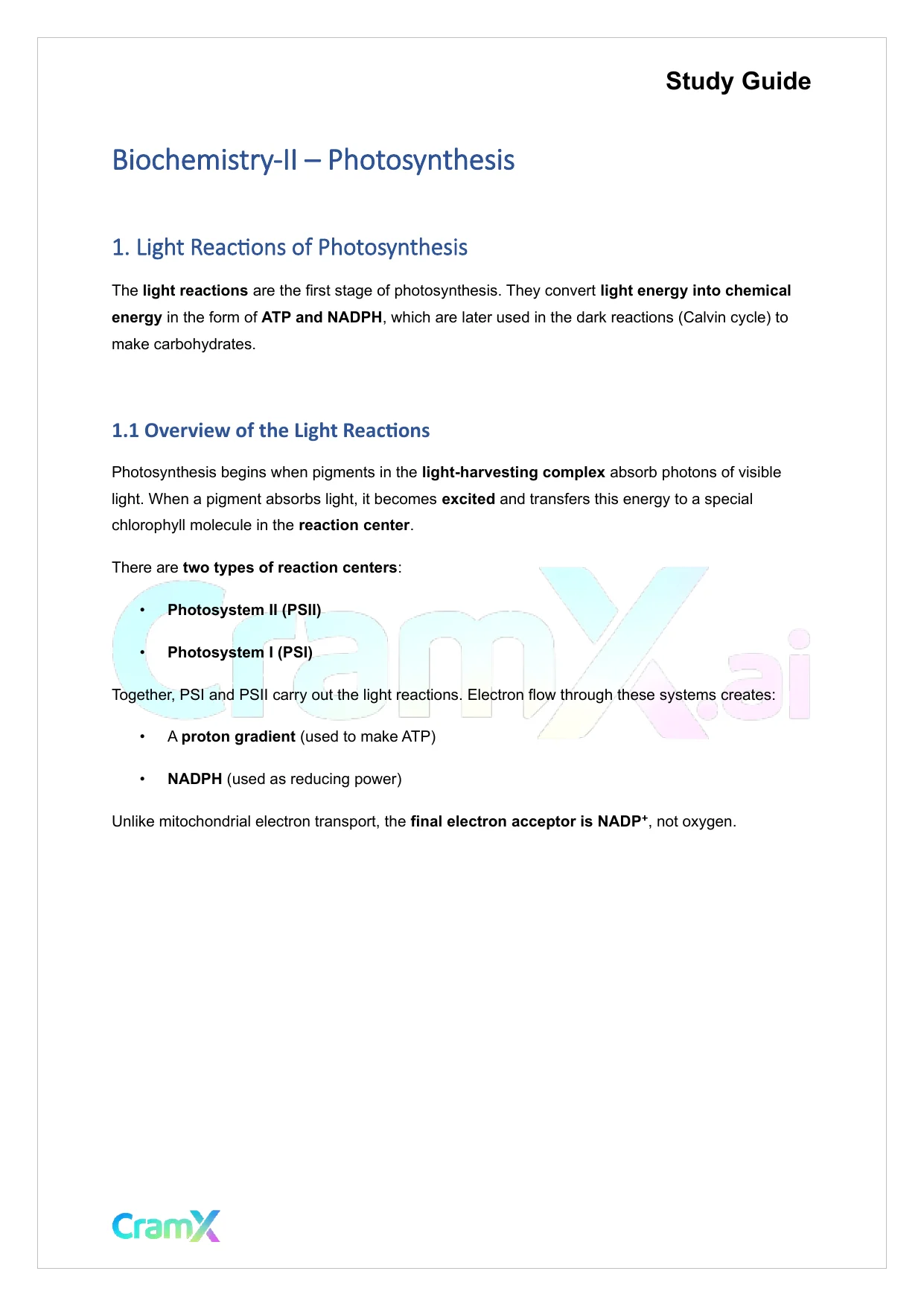 This document provides study materials related to Biochemistry-II - Photosynthesis. It may include explanations, summarized notes, examples, or practice questions designed to help students understand key concepts and review important topics covered in their coursework.