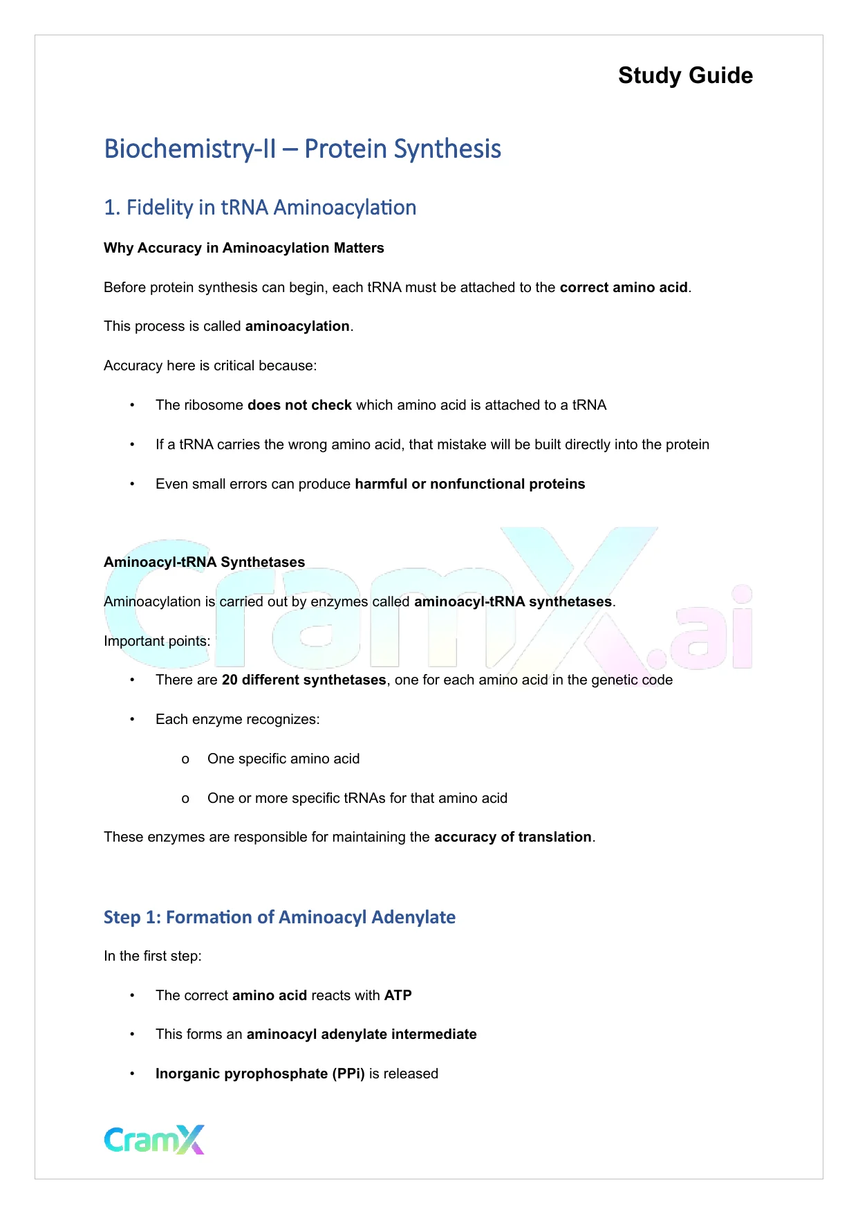 This document provides study materials related to Biochemistry-II - Protein Synthesis. It may include explanations, summarized notes, examples, or practice questions designed to help students understand key concepts and review important topics covered in their coursework.