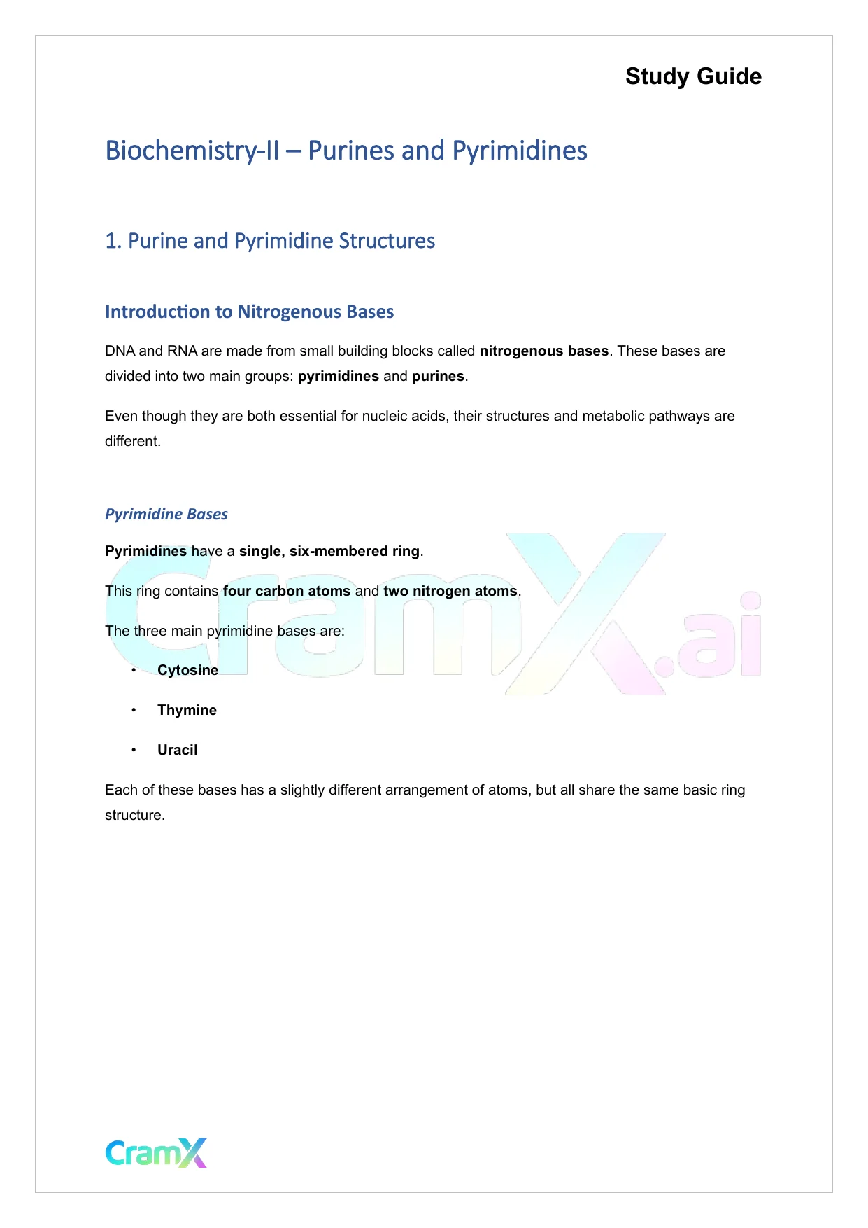 This document provides study materials related to Biochemistry-II - Purines and Pyrimidines. It may include explanations, summarized notes, examples, or practice questions designed to help students understand key concepts and review important topics covered in their coursework.