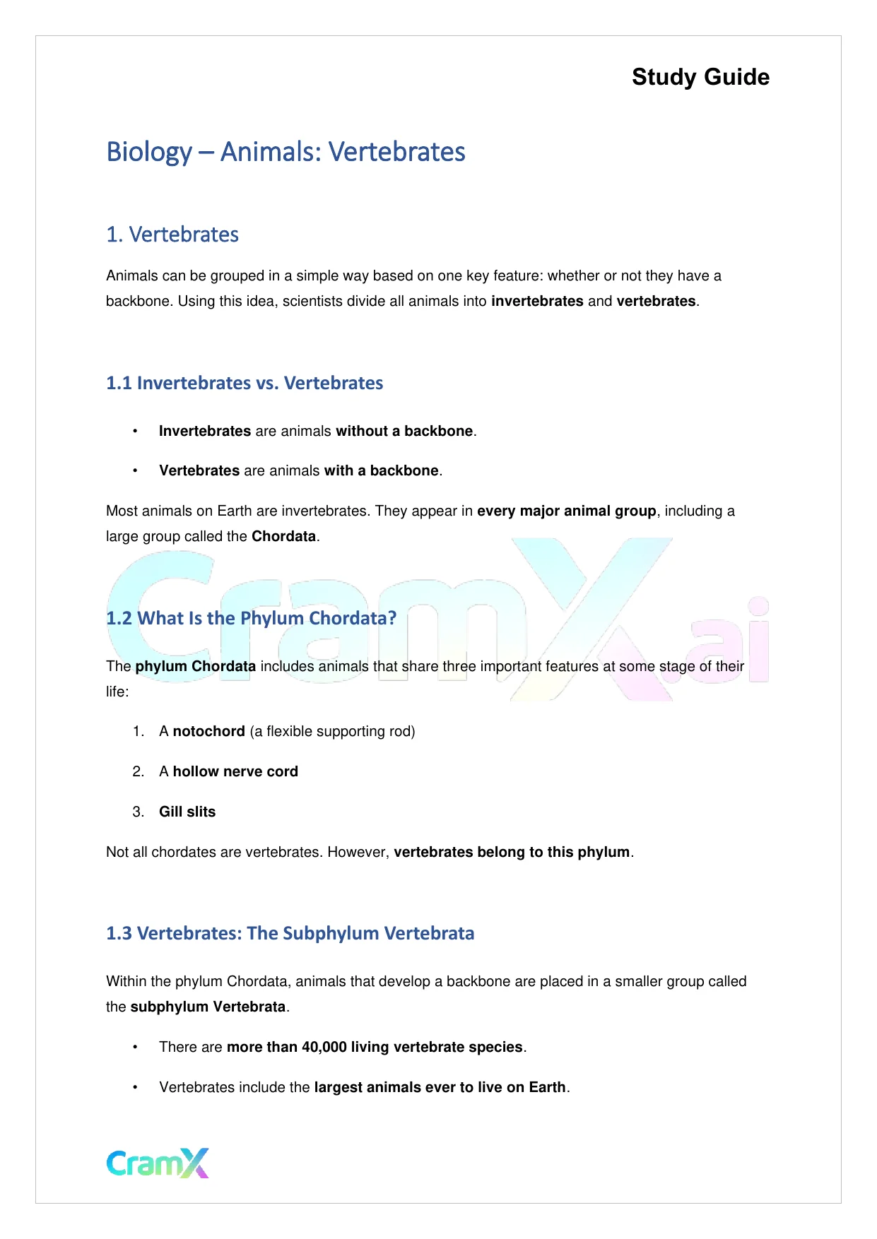 This document provides study materials related to Biology - Animals Vertebrates. It may include explanations, summarized notes, examples, or practice questions designed to help students understand key concepts and review important topics covered in their coursework.
