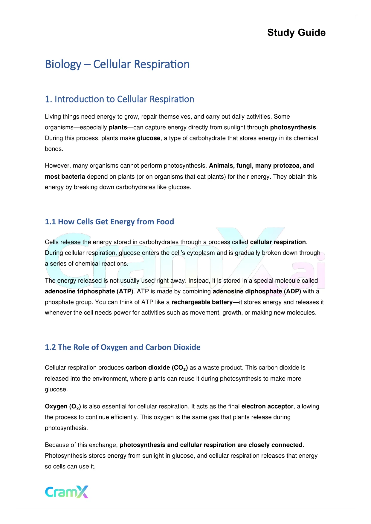 This document provides study materials related to Biology - Cellular Respiration. It may include explanations, summarized notes, examples, or practice questions designed to help students understand key concepts and review important topics covered in their coursework.