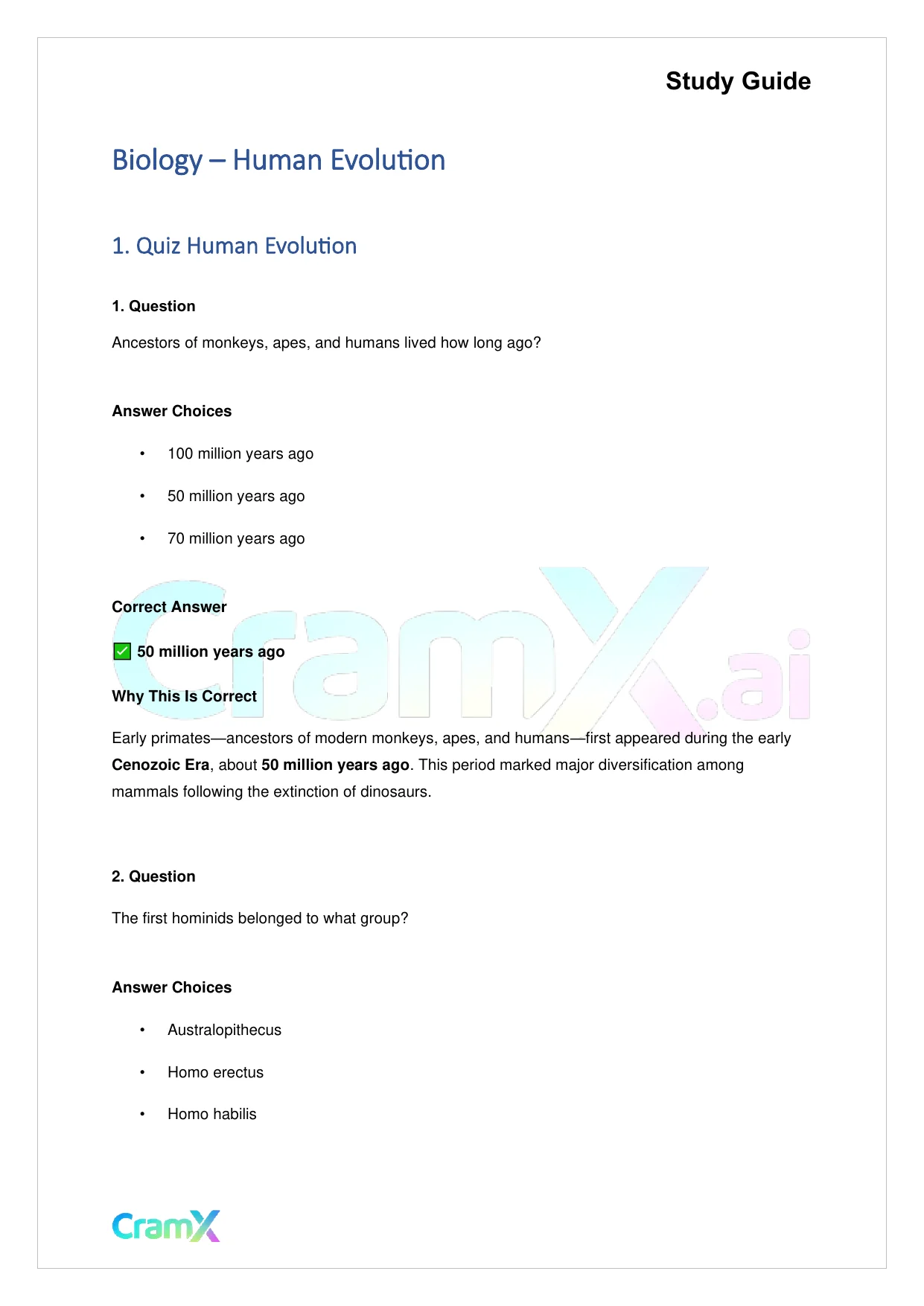 This document provides study materials related to Biology - Human Evolution. It may include explanations, summarized notes, examples, or practice questions designed to help students understand key concepts and review important topics covered in their coursework.