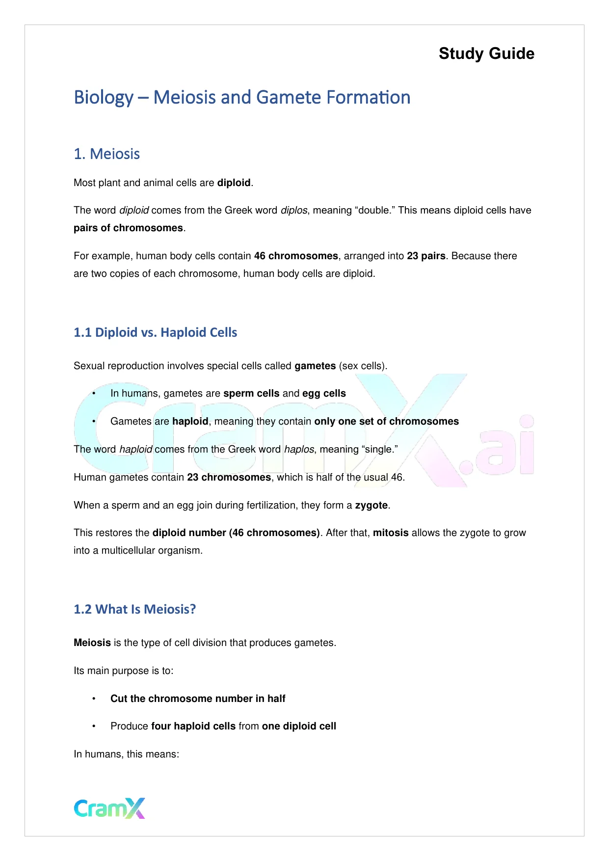 This document provides study materials related to Biology - Meiosis and Gamete Formation. It may include explanations, summarized notes, examples, or practice questions designed to help students understand key concepts and review important topics covered in their coursework.