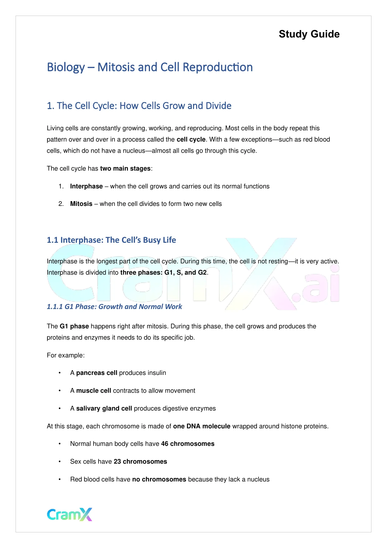 This document provides study materials related to Biology - Mitosis and Cell Reproduction. It may include explanations, summarized notes, examples, or practice questions designed to help students understand key concepts and review important topics covered in their coursework.