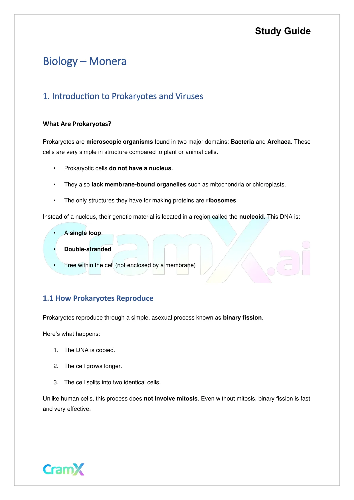 This document provides study materials related to Biology - Monera. It may include explanations, summarized notes, examples, or practice questions designed to help students understand key concepts and review important topics covered in their coursework.