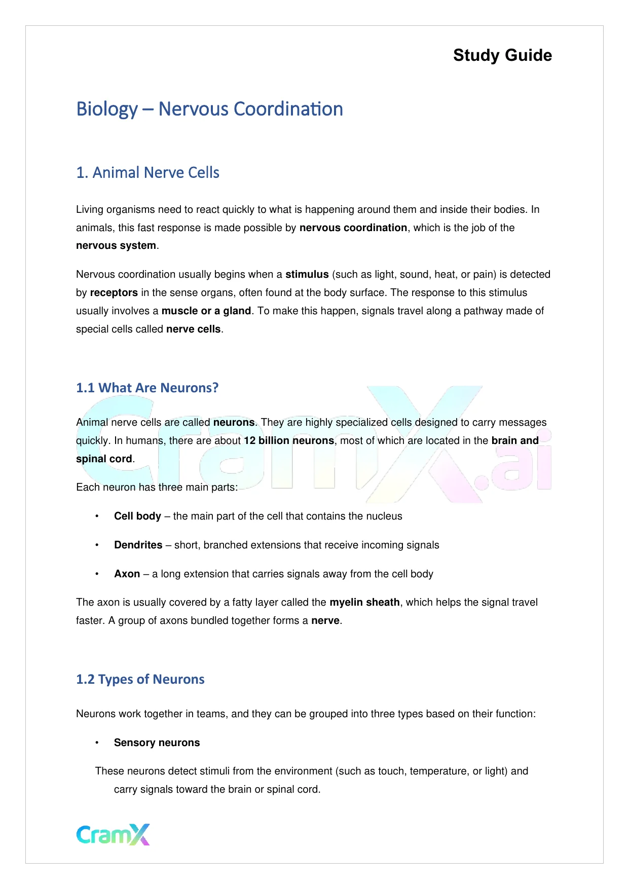 This document provides study materials related to Biology - Nervous Coordination. It may include explanations, summarized notes, examples, or practice questions designed to help students understand key concepts and review important topics covered in their coursework.