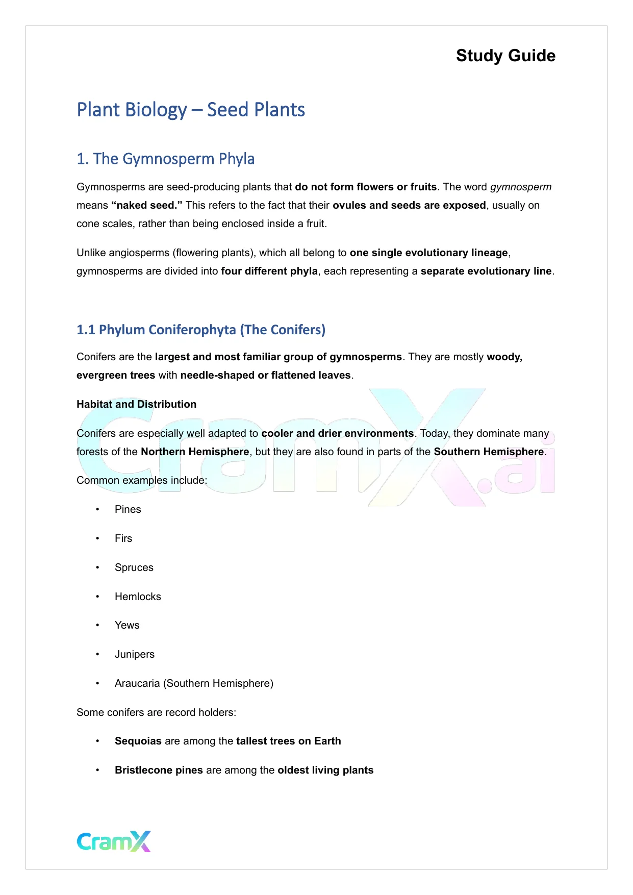 This document provides study materials related to Plant Biology - Seed Plants. It may include explanations, summarized notes, examples, or practice questions designed to help students understand key concepts and review important topics covered in their coursework.