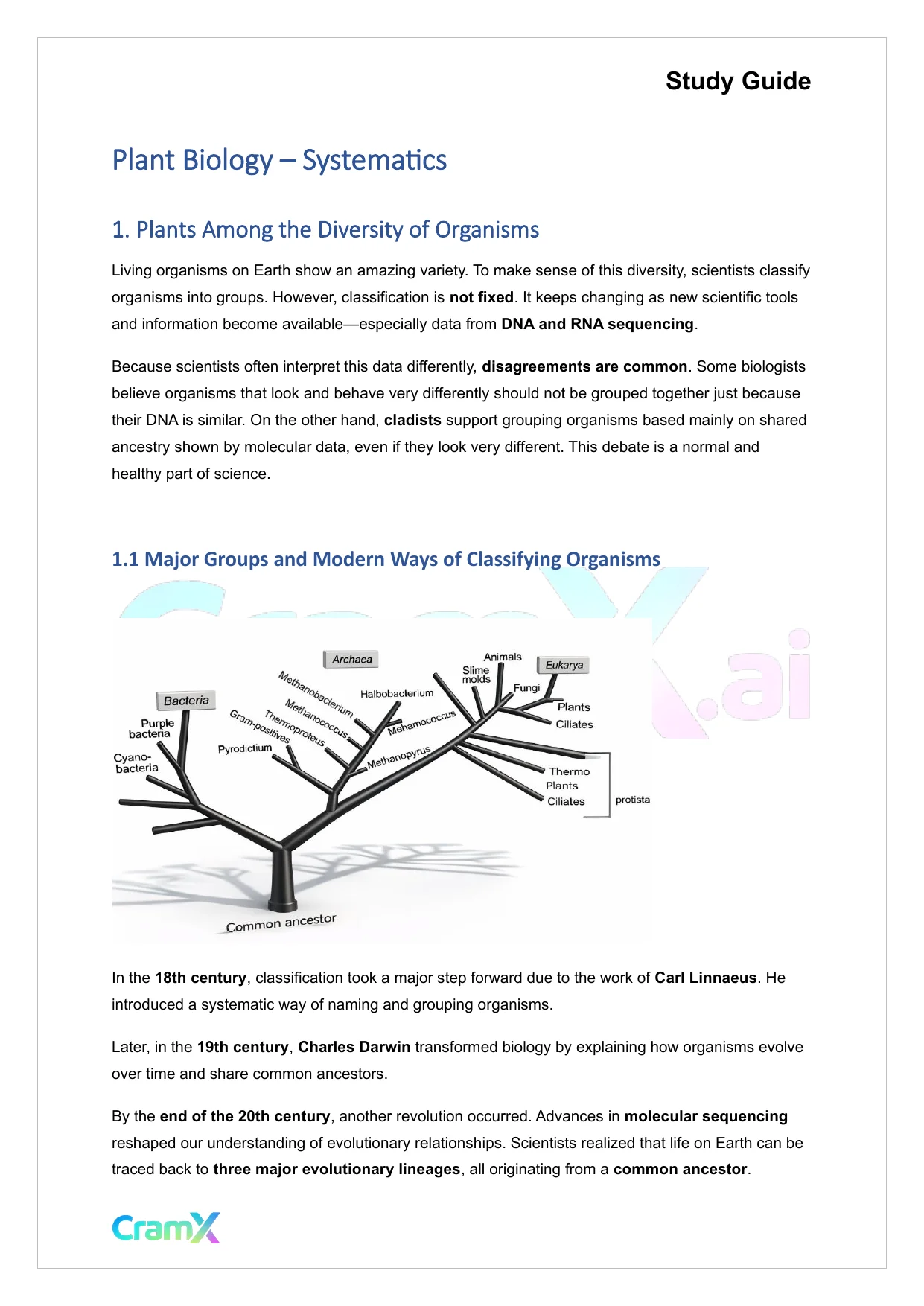 This document provides study materials related to Plant Biology - Systematics. It may include explanations, summarized notes, examples, or practice questions designed to help students understand key concepts and review important topics covered in their coursework.