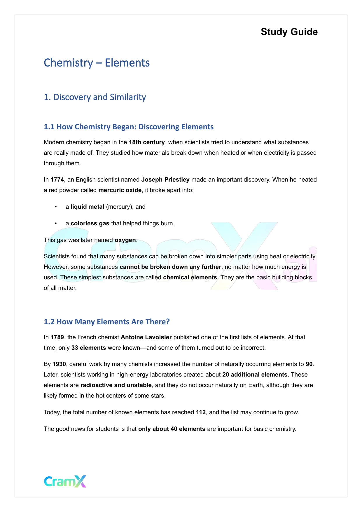 This document provides study materials related to Chemistry - Elements. It may include explanations, summarized notes, examples, or practice questions designed to help students understand key concepts and review important topics covered in their coursework.