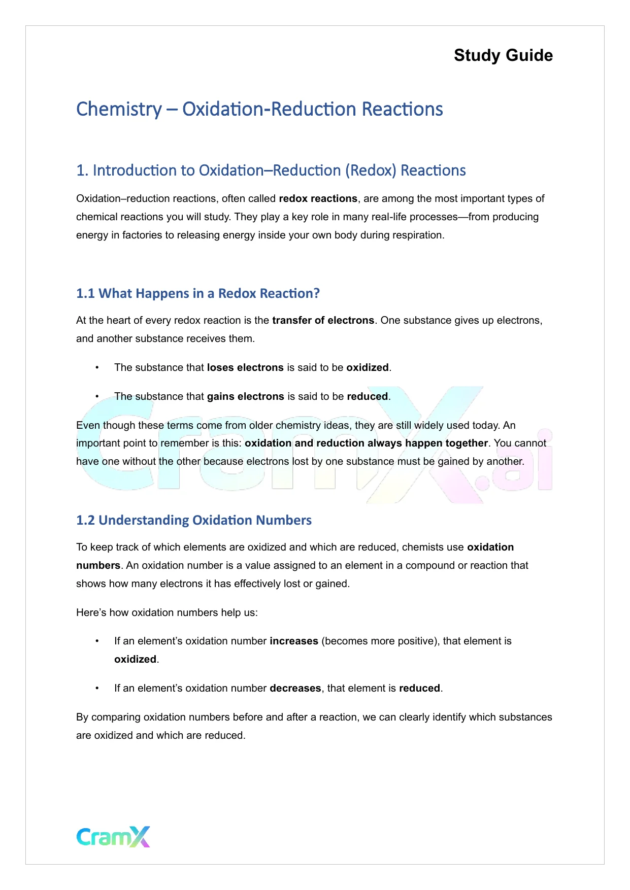 This document provides study materials related to Chemistry - Oxidation‐Reduction Reactions. It may include explanations, summarized notes, examples, or practice questions designed to help students understand key concepts and review important topics covered in their coursework.