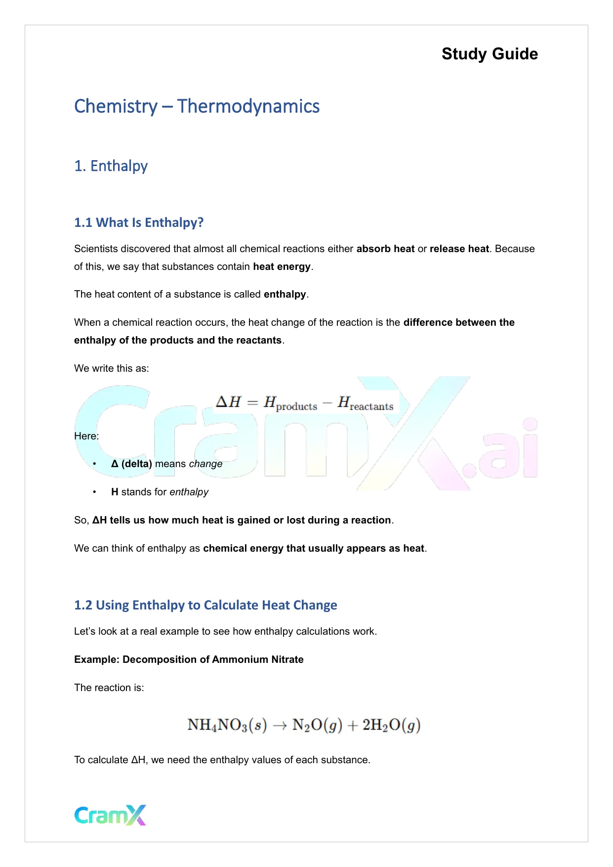 This document provides study materials related to Chemistry - Thermodynamics. It may include explanations, summarized notes, examples, or practice questions designed to help students understand key concepts and review important topics covered in their coursework.