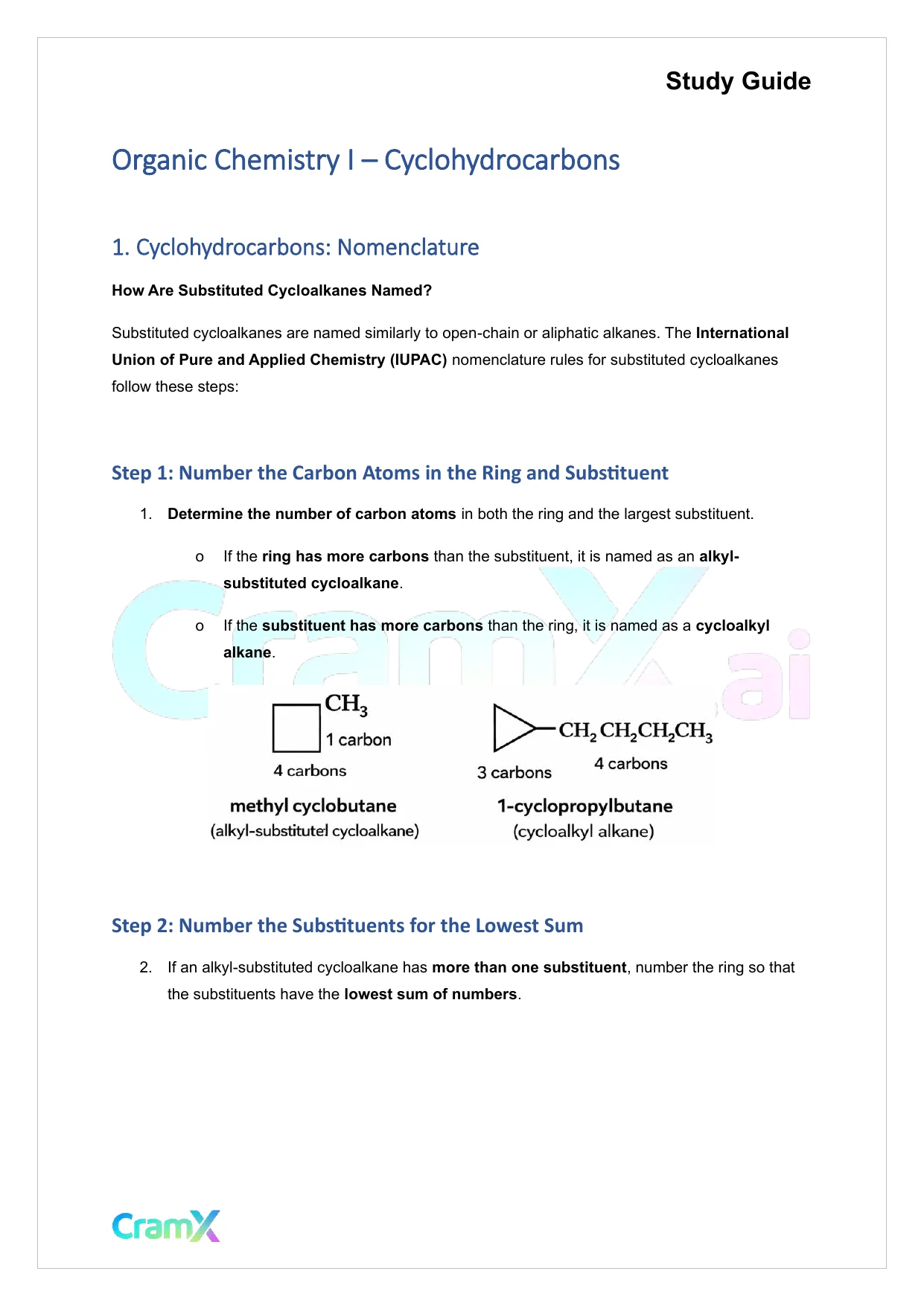 This document provides study materials related to Organic Chemistry I - Cyclohydrocarbons. It may include explanations, summarized notes, examples, or practice questions designed to help students understand key concepts and review important topics covered in their coursework.