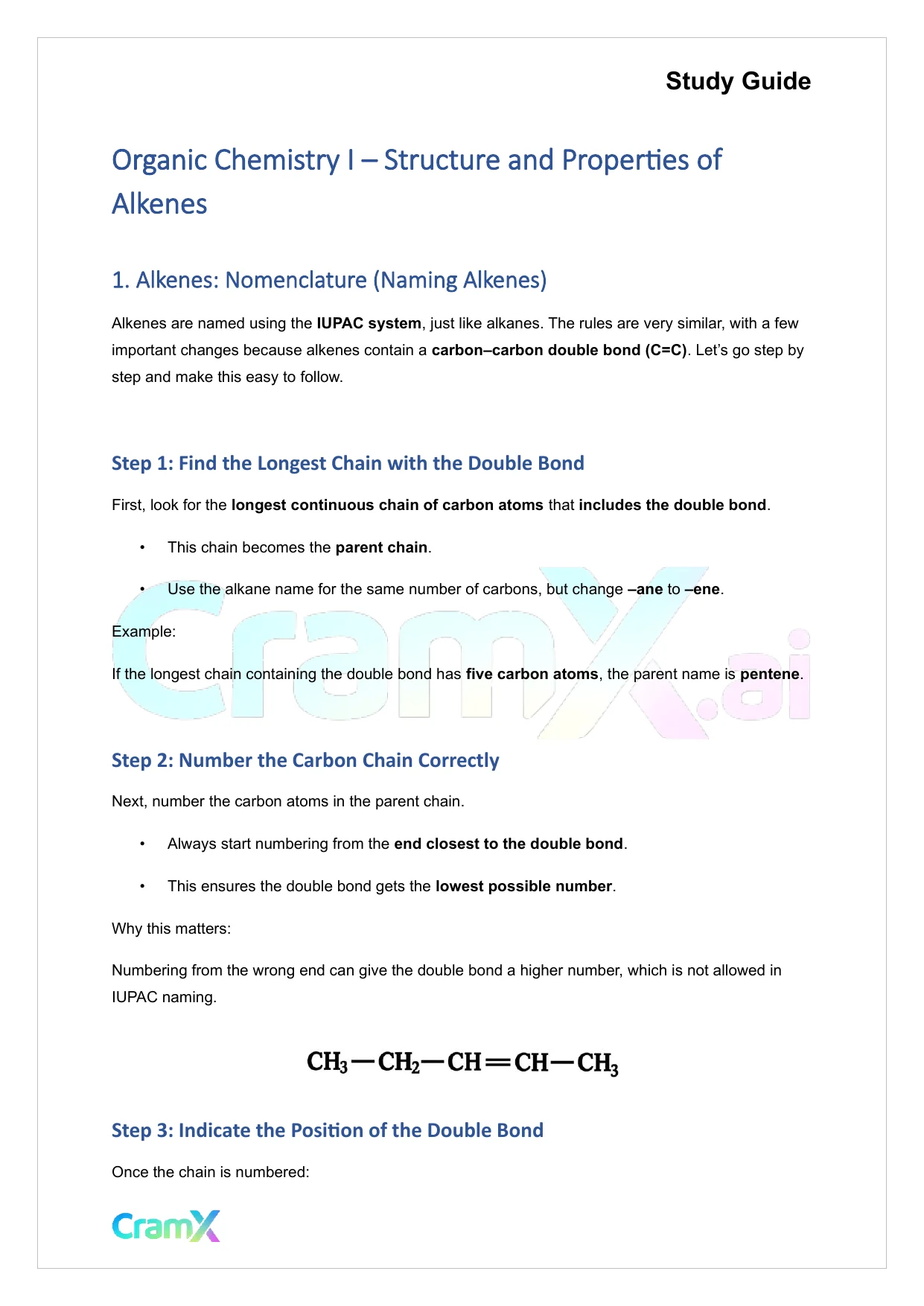 This document provides study materials related to Organic Chemistry I - Structure and Properties of Alkenes. It may include explanations, summarized notes, examples, or practice questions designed to help students understand key concepts and review important topics covered in their coursework.