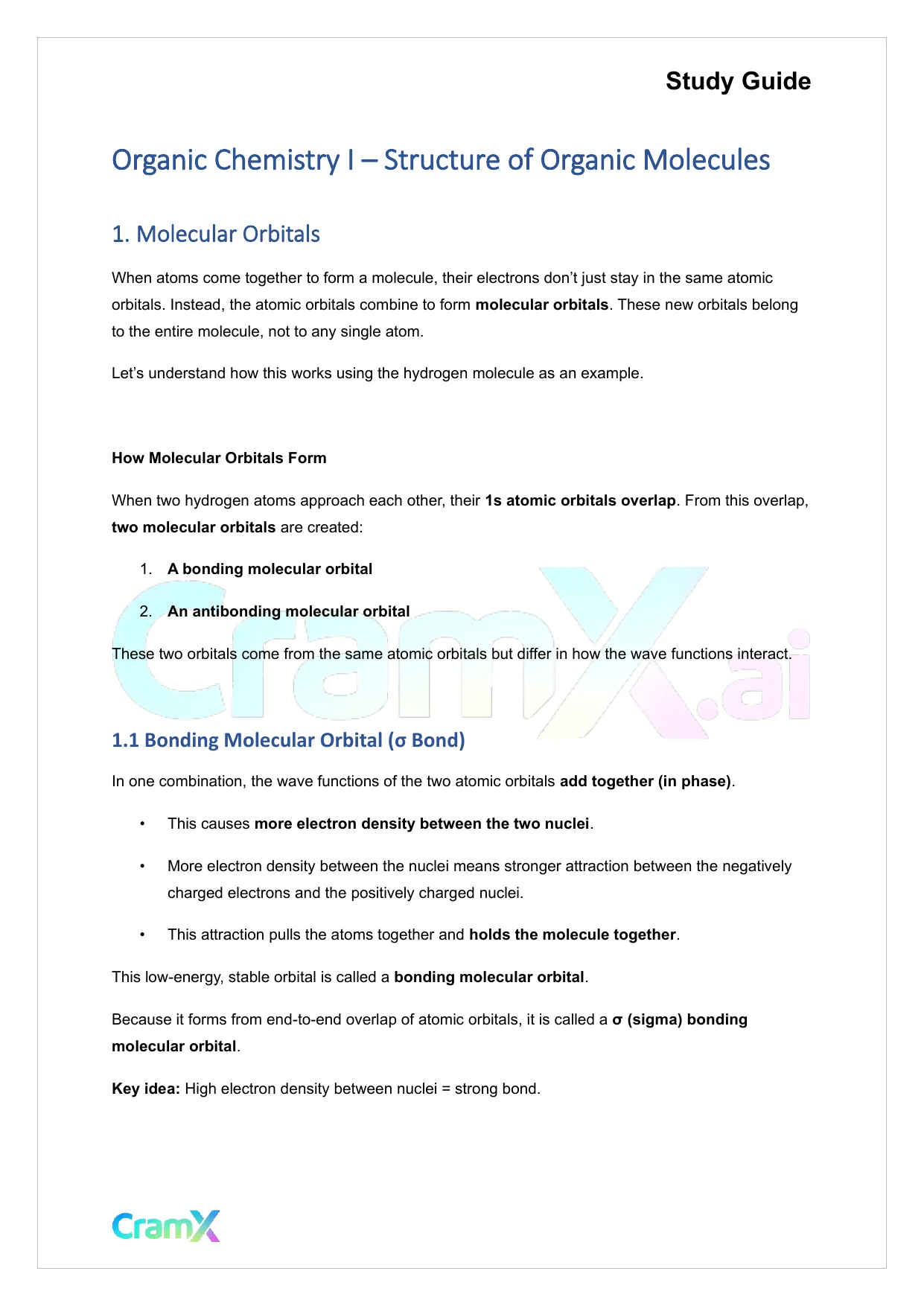 This document provides study materials related to Organic Chemistry I - Structure of Organic Molecules. It may include explanations, summarized notes, examples, or practice questions designed to help students understand key concepts and review important topics covered in their coursework.