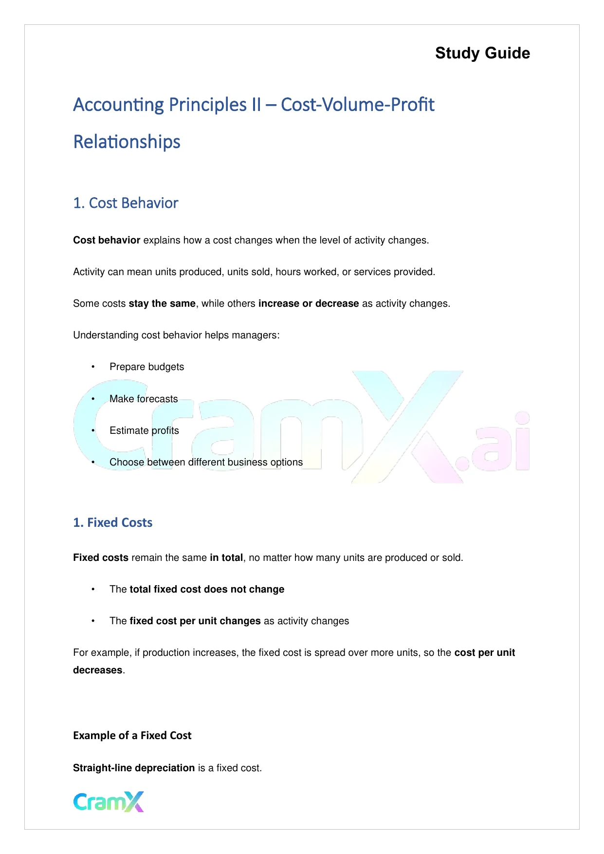 This document provides study materials related to Accounting Principles II – Cost-Volume-Profit Relationships. It may include explanations, summarized notes, examples, or practice questions designed to help students understand key concepts and review important topics covered in their coursework.