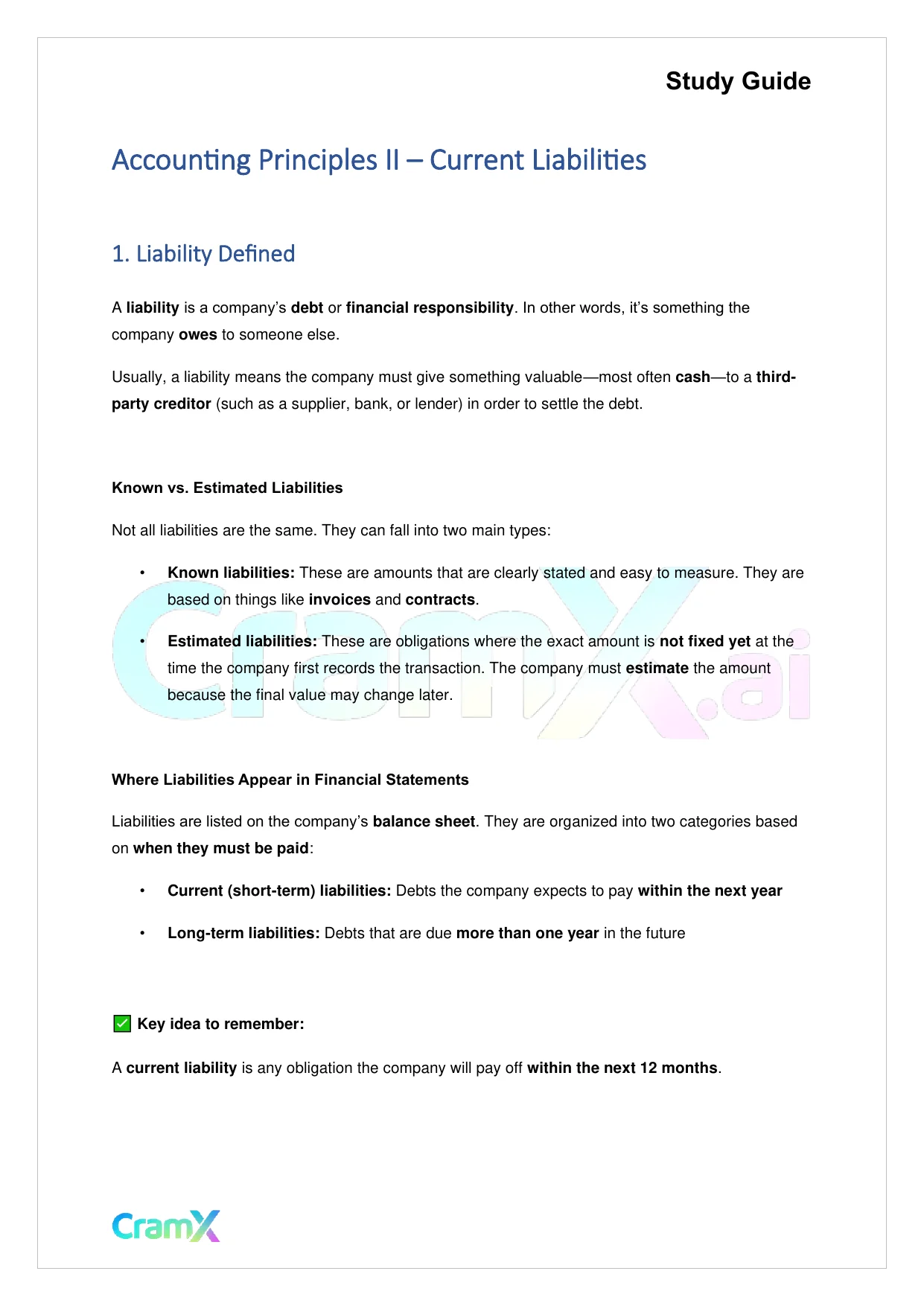 This document provides study materials related to Accounting Principles II – Current Liabilities. It may include explanations, summarized notes, examples, or practice questions designed to help students understand key concepts and review important topics covered in their coursework.