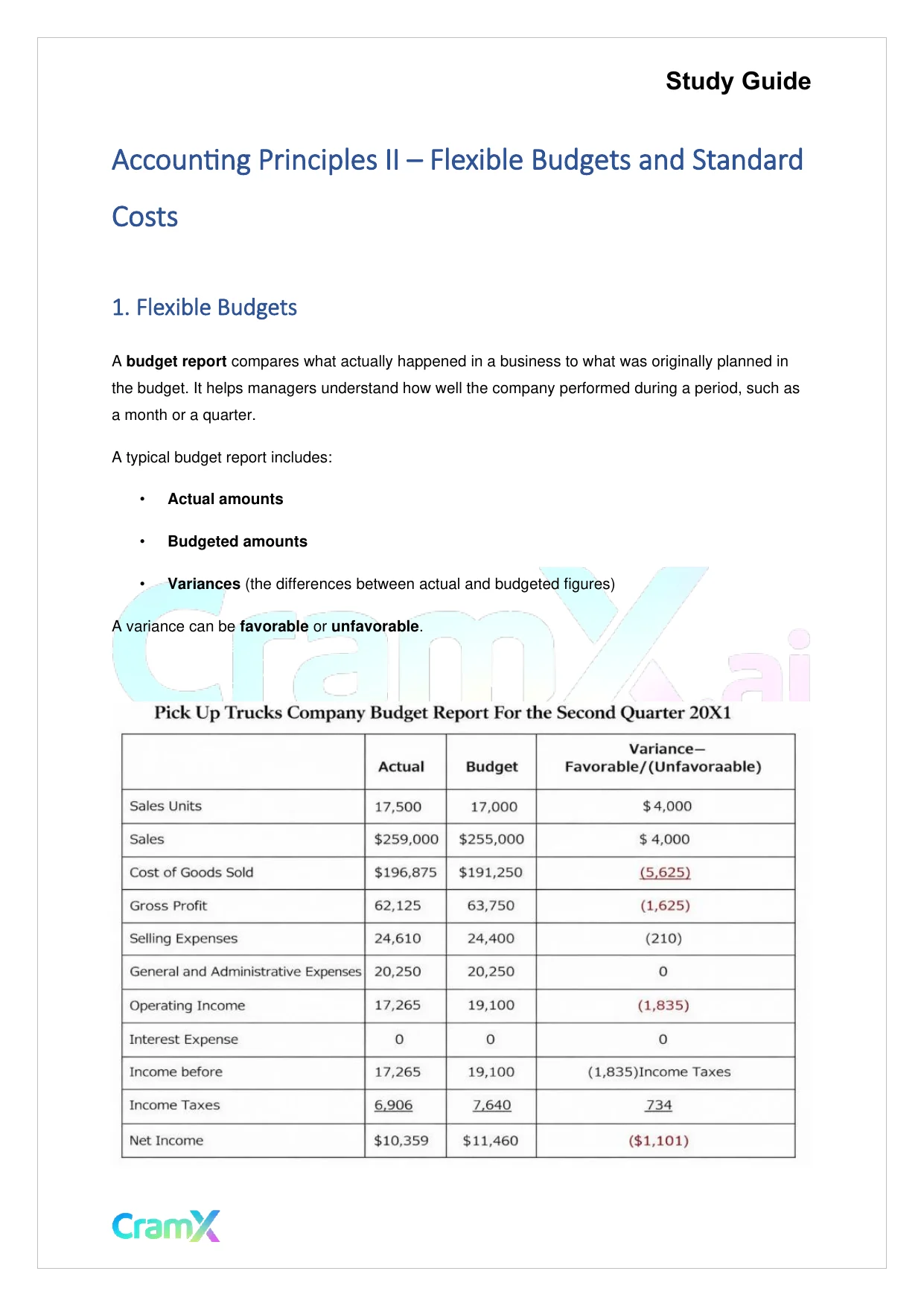 This document provides study materials related to Accounting Principles II – Flexible Budgets and Standard Costs. It may include explanations, summarized notes, examples, or practice questions designed to help students understand key concepts and review important topics covered in their coursework.