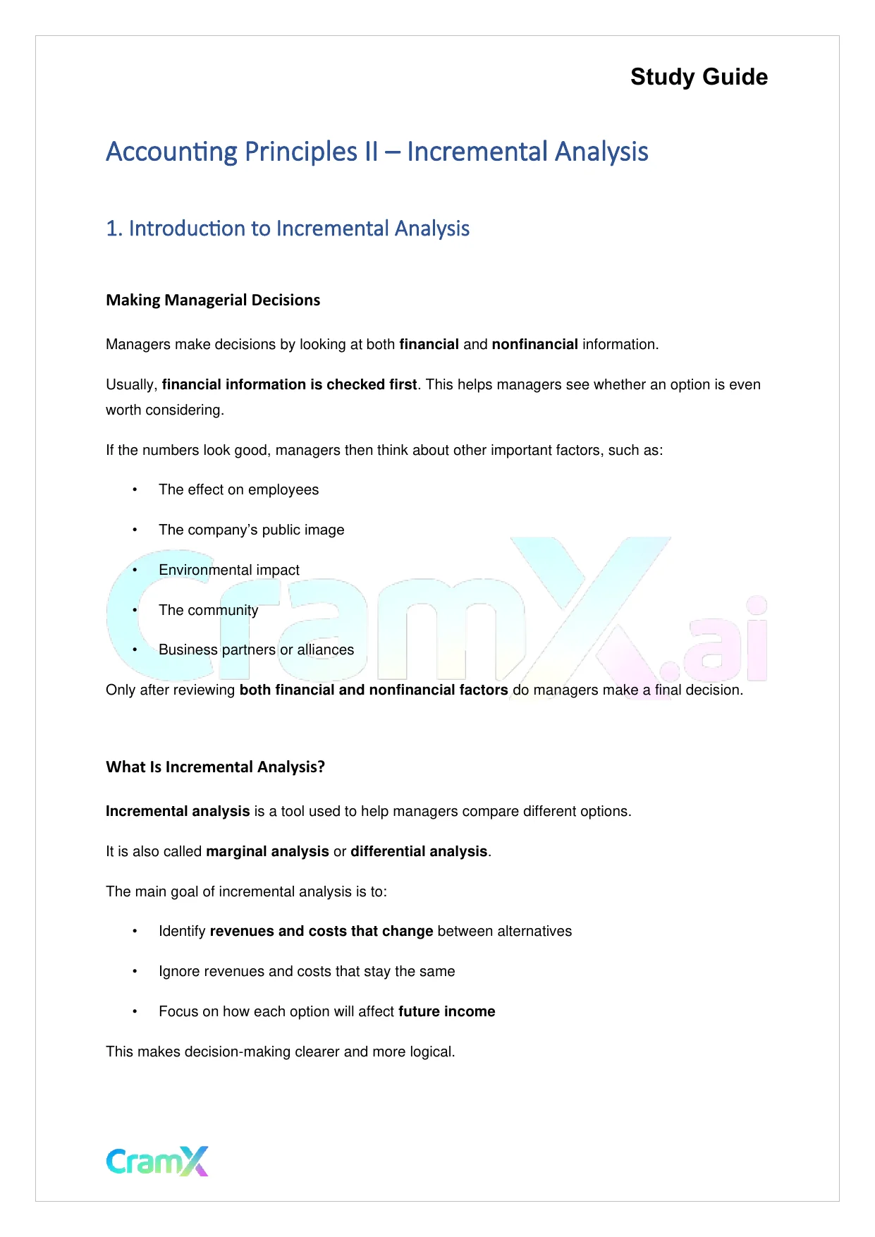 This document provides study materials related to Accounting Principles II – Incremental Analysis. It may include explanations, summarized notes, examples, or practice questions designed to help students understand key concepts and review important topics covered in their coursework.