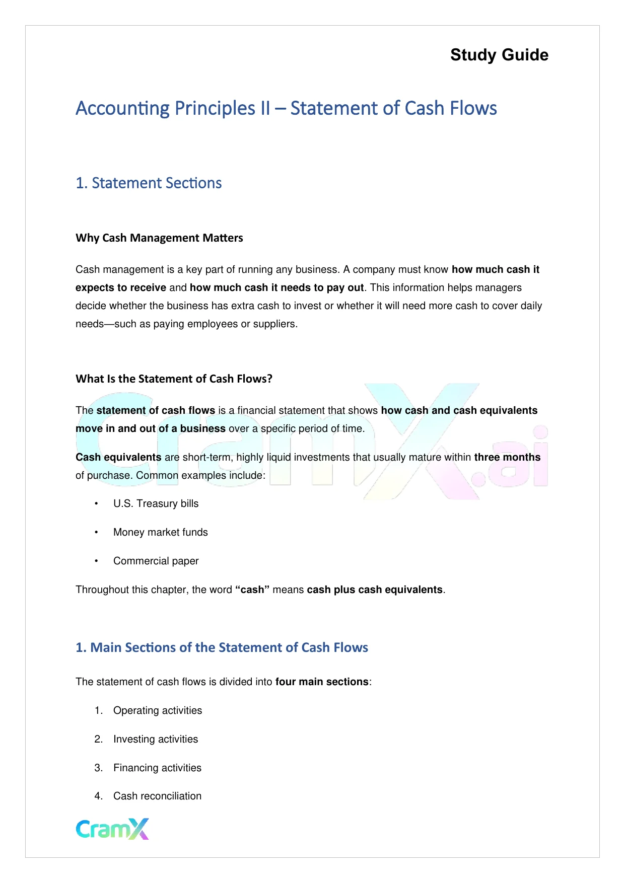 This document provides study materials related to Accounting Principles II – Statement of Cash Flows. It may include explanations, summarized notes, examples, or practice questions designed to help students understand key concepts and review important topics covered in their coursework.