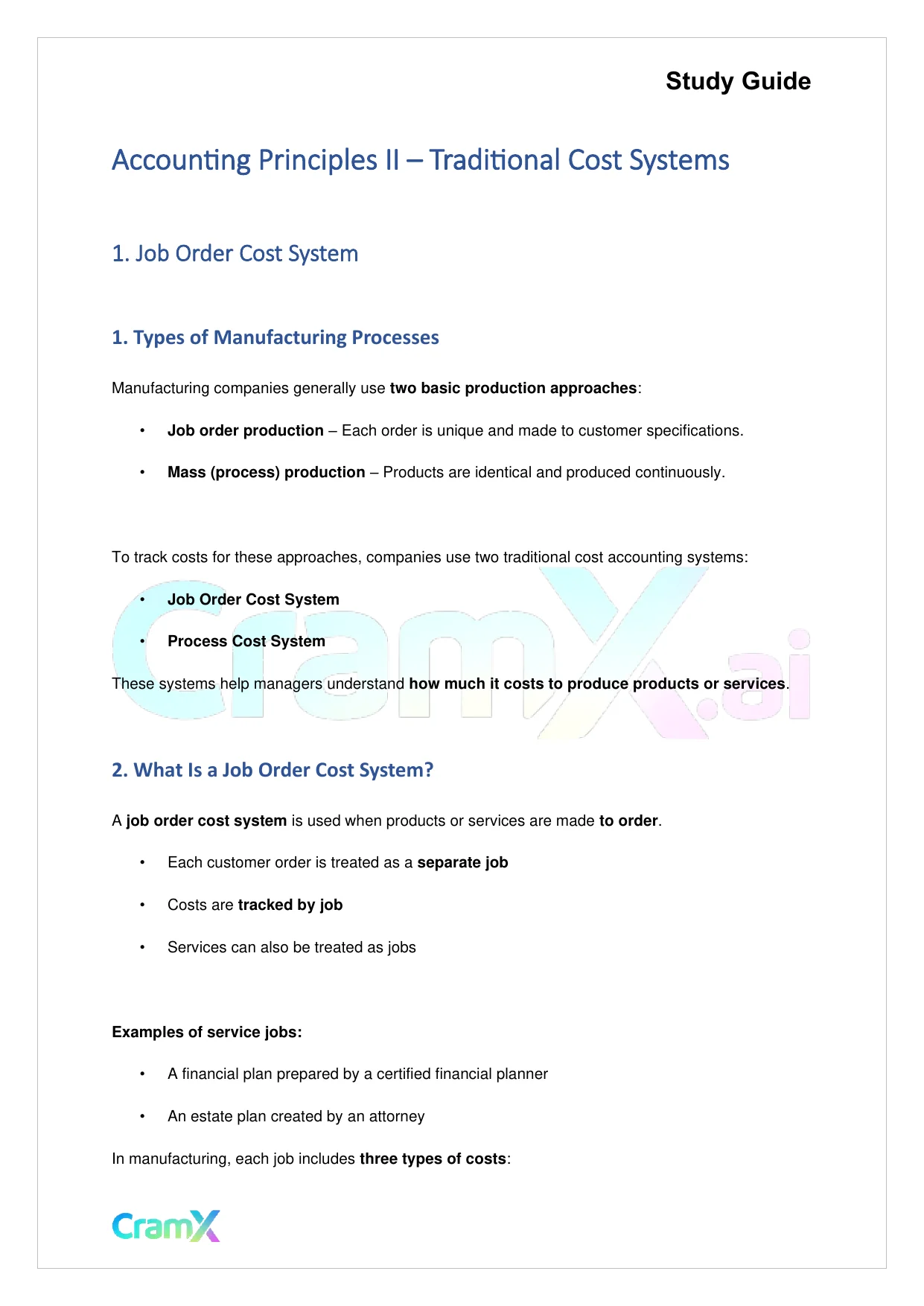This document provides study materials related to Accounting Principles II – Traditional Cost Systems. It may include explanations, summarized notes, examples, or practice questions designed to help students understand key concepts and review important topics covered in their coursework.