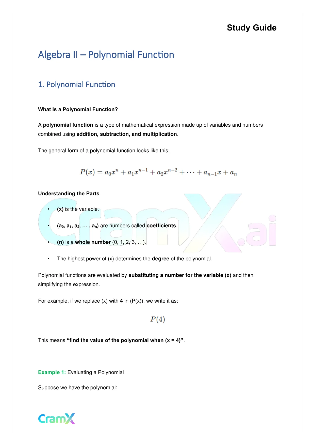 This document provides study materials related to Algebra II – Polynomial Function. It may include explanations, summarized notes, examples, or practice questions designed to help students understand key concepts and review important topics covered in their coursework.