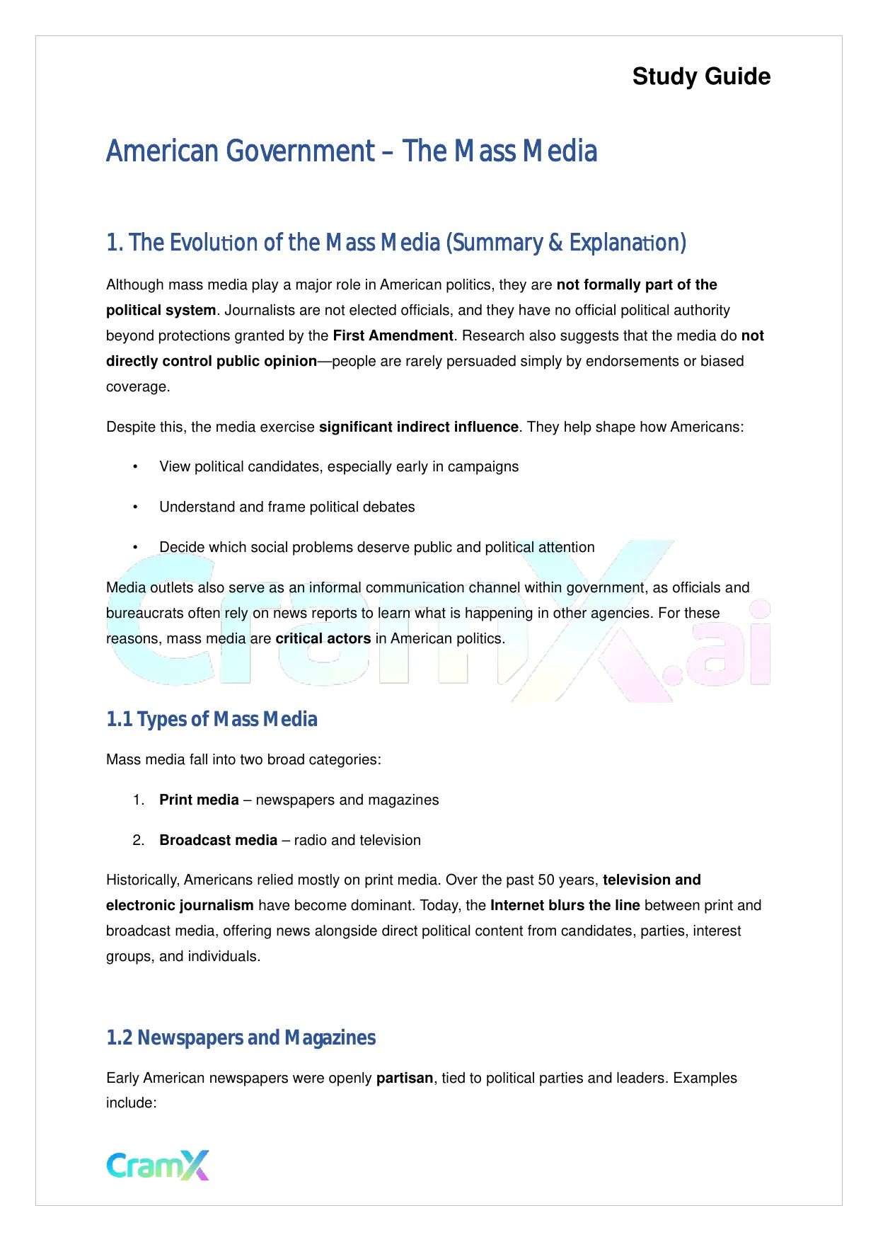 This document provides study materials related to American Government - The Mass Media. It may include explanations, summarized notes, examples, or practice questions designed to help students understand key concepts and review important topics covered in their coursework.