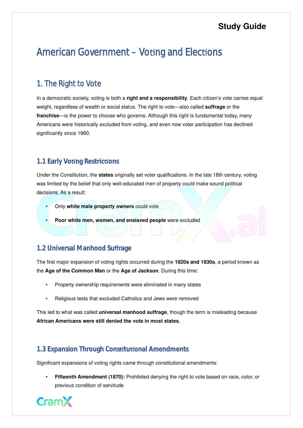 This document provides study materials related to American Government - Voting and Elections. It may include explanations, summarized notes, examples, or practice questions designed to help students understand key concepts and review important topics covered in their coursework.