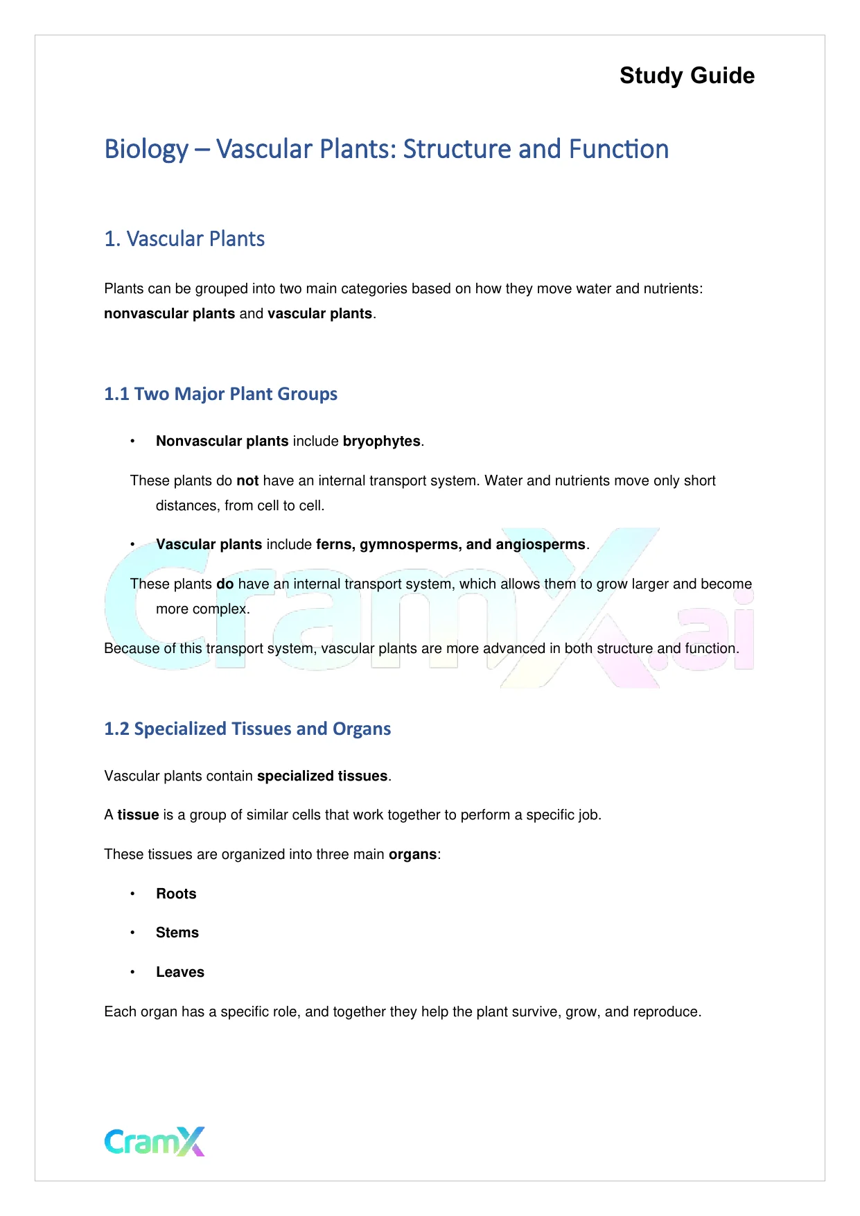 This document provides study materials related to Biology - Vascular Plants Structure and Function. It may include explanations, summarized notes, examples, or practice questions designed to help students understand key concepts and review important topics covered in their coursework.