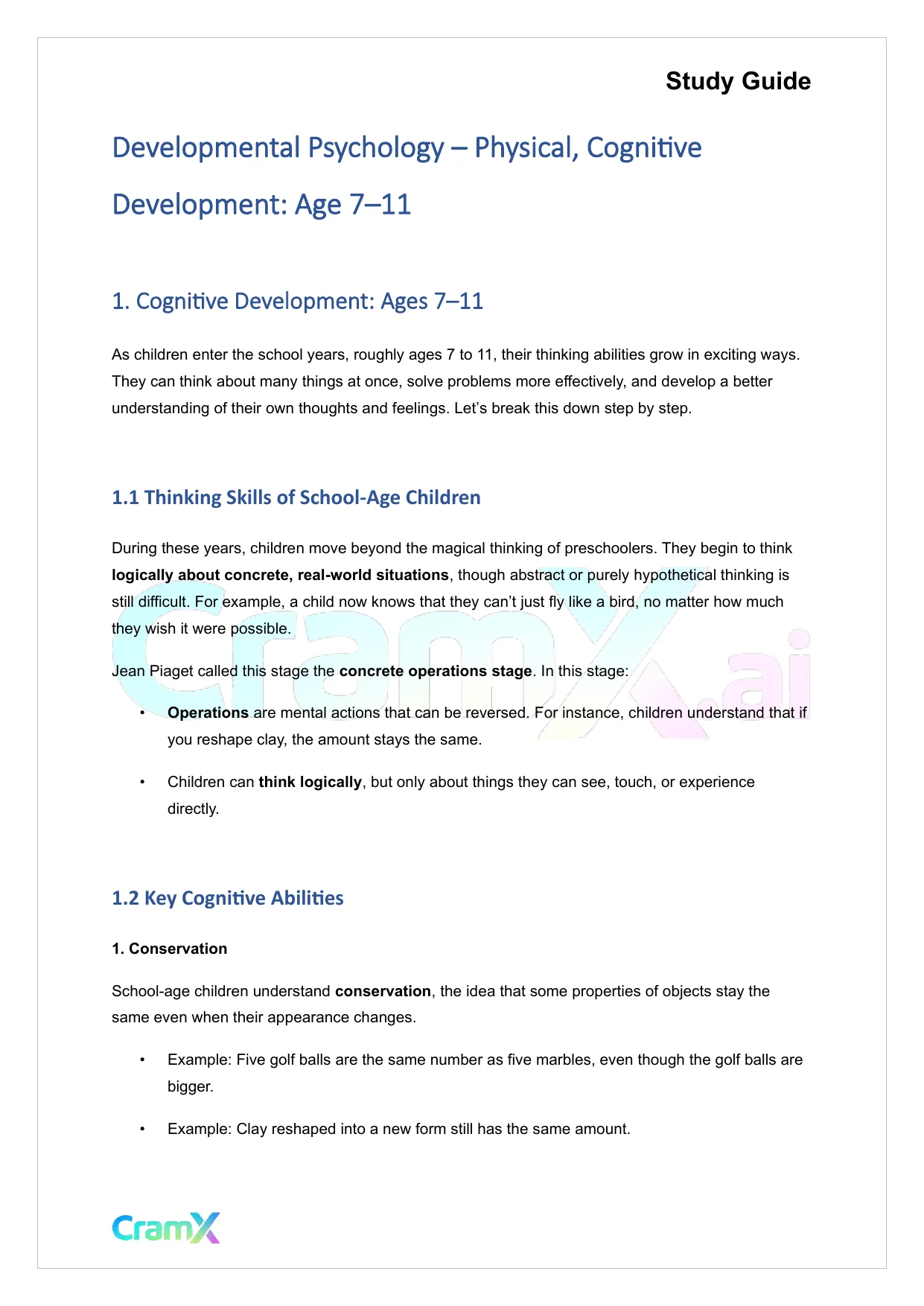 This document provides study materials related to Developmental Psychology - Physical, Cognitive Development Age 7–11. It may include explanations, summarized notes, examples, or practice questions designed to help students understand key concepts and review important topics covered in their coursework.