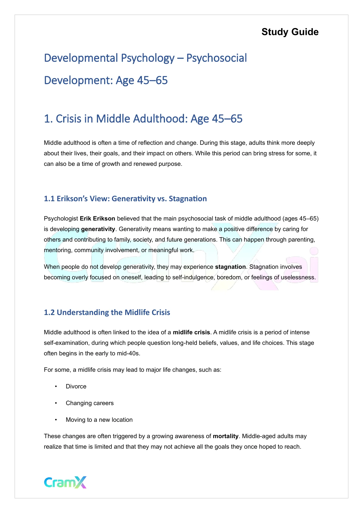 This document provides study materials related to Developmental Psychology - Psychosocial Development Age 45–65. It may include explanations, summarized notes, examples, or practice questions designed to help students understand key concepts and review important topics covered in their coursework.