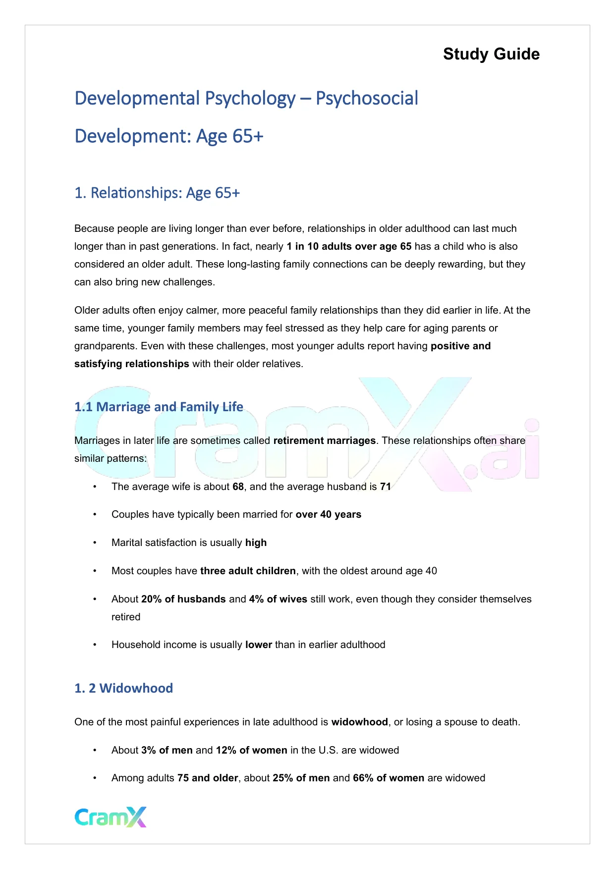 This document provides study materials related to Developmental Psychology - Psychosocial Development Age 65+. It may include explanations, summarized notes, examples, or practice questions designed to help students understand key concepts and review important topics covered in their coursework.