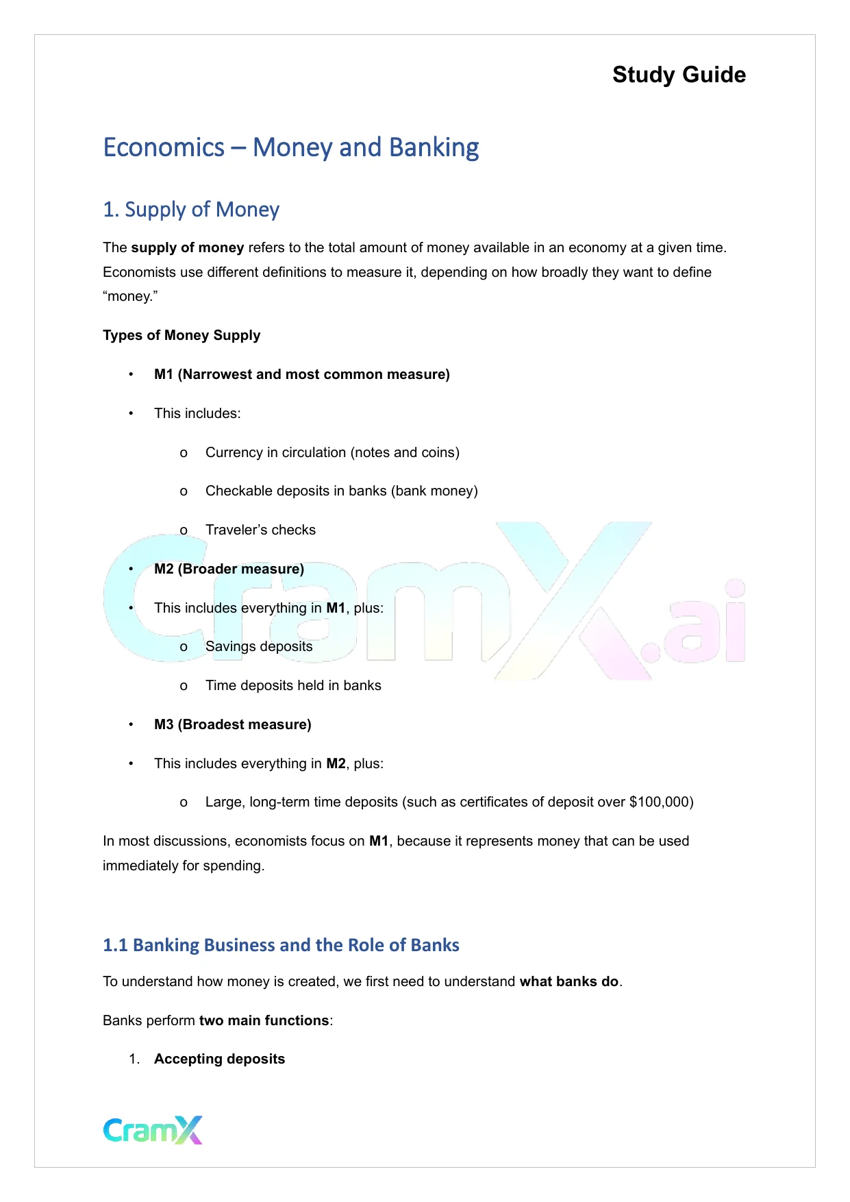 This document provides study materials related to Economics - Money and Banking. It may include explanations, summarized notes, examples, or practice questions designed to help students understand key concepts and review important topics covered in their coursework.