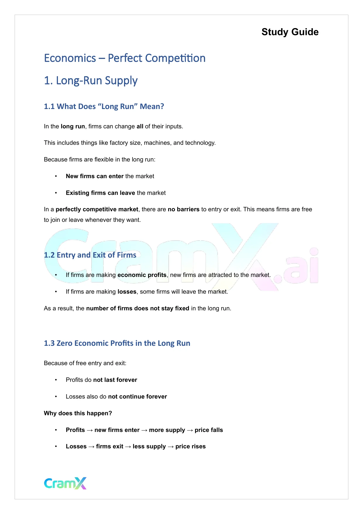 This document provides study materials related to Economics - Perfect Competition. It may include explanations, summarized notes, examples, or practice questions designed to help students understand key concepts and review important topics covered in their coursework.
