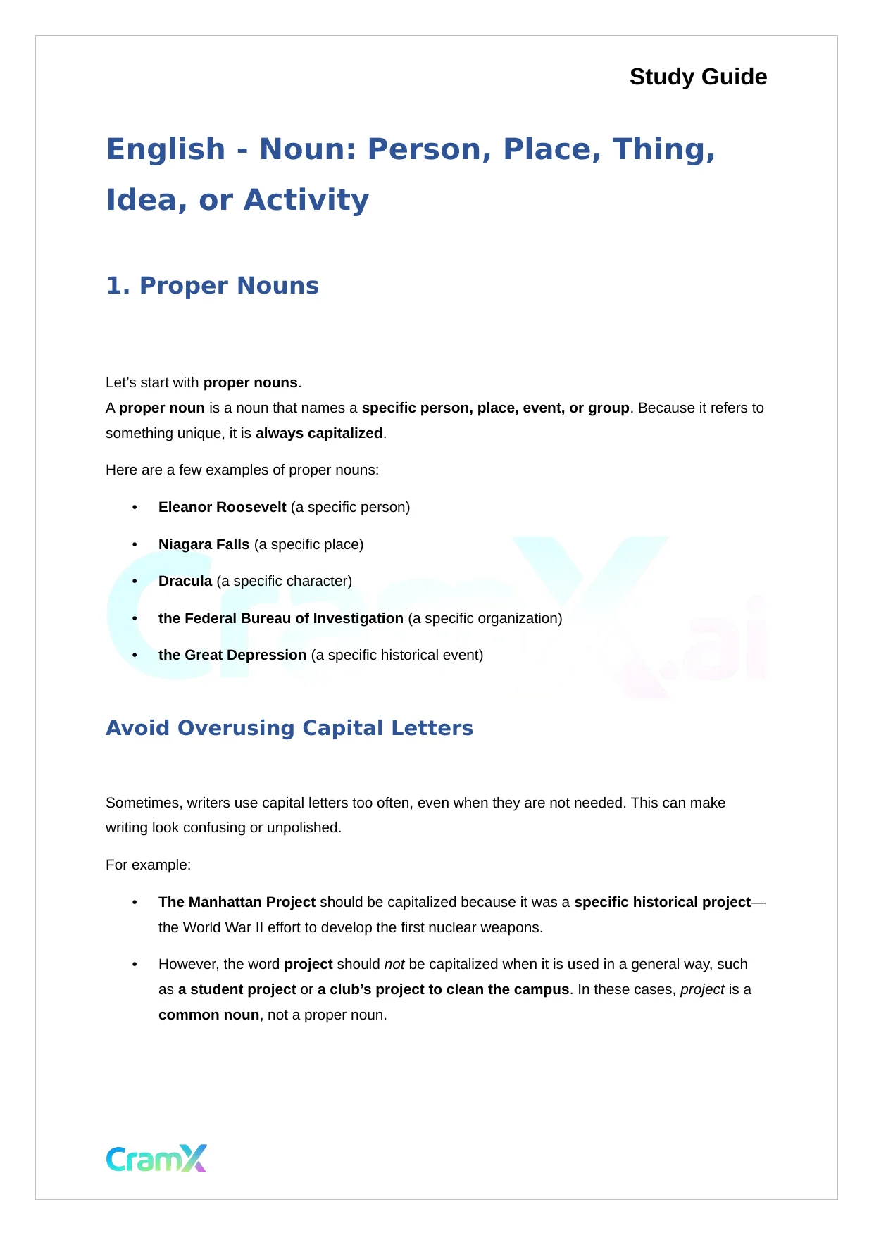 Study GuideEnglish - Noun: Person, Place, Thing,Idea, or Activity1. Proper NounsLet’s start withproper nouns.Aproper nounis a noun that names aspecific person, place, event, or group. Because it refers tosomething unique, it isalways capitalized.Here are a few examples of proper nouns:•Eleanor Roosevelt(a specific person)•Niagara Falls(a specific place)•Dracula(a specific character)•the Federal Bureau of Investigation(a specific organization)•the Great Depression(a specific historical event)Avoid Overusing Capital LettersSometimes, writers use capital letters too often, even when they are not needed. This can makewriting look confusing or unpolished.For example:•The Manhattan Projectshould be capitalized because it was aspecific historical project—the World War II effort to develop the first nuclear weapons.•However, the wordprojectshouldnotbe capitalized when it is used in a general way, suchasa student projectora club’s project to clean the campus. In these cases,projectis acommon noun, not a proper noun.