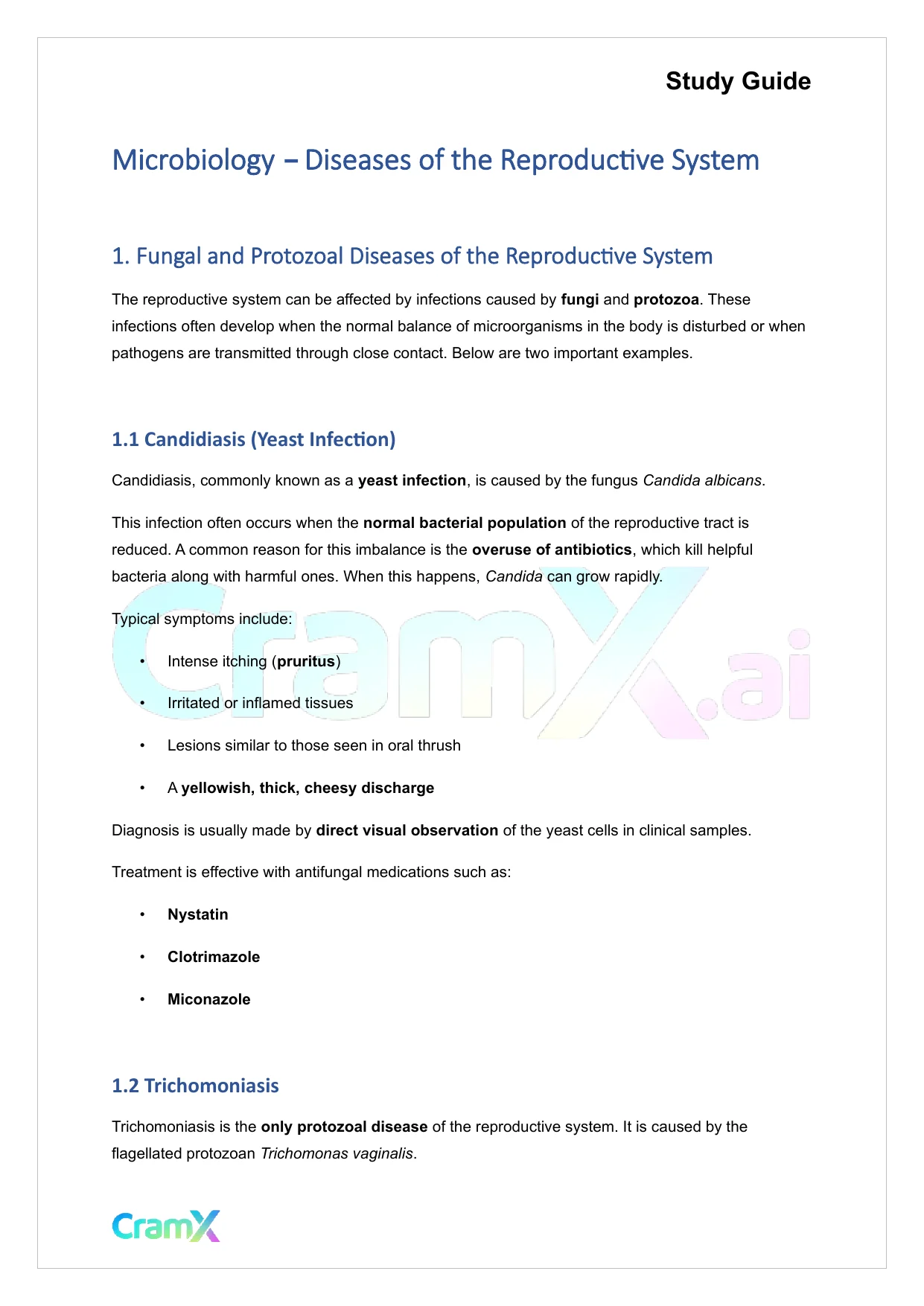 This document provides study materials related to Microbiology - Diseases of the Reproductive System. It may include explanations, summarized notes, examples, or practice questions designed to help students understand key concepts and review important topics covered in their coursework.