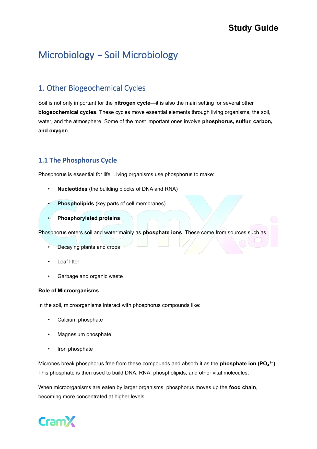 This document provides study materials related to Microbiology - Soil Microbiology. It may include explanations, summarized notes, examples, or practice questions designed to help students understand key concepts and review important topics covered in their coursework.
