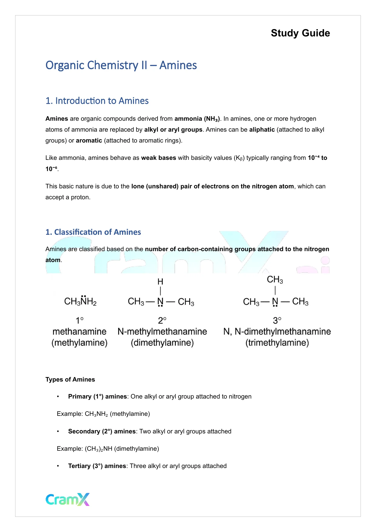 This document provides study materials related to Organic Chemistry II - Amines. It may include explanations, summarized notes, examples, or practice questions designed to help students understand key concepts and review important topics covered in their coursework.