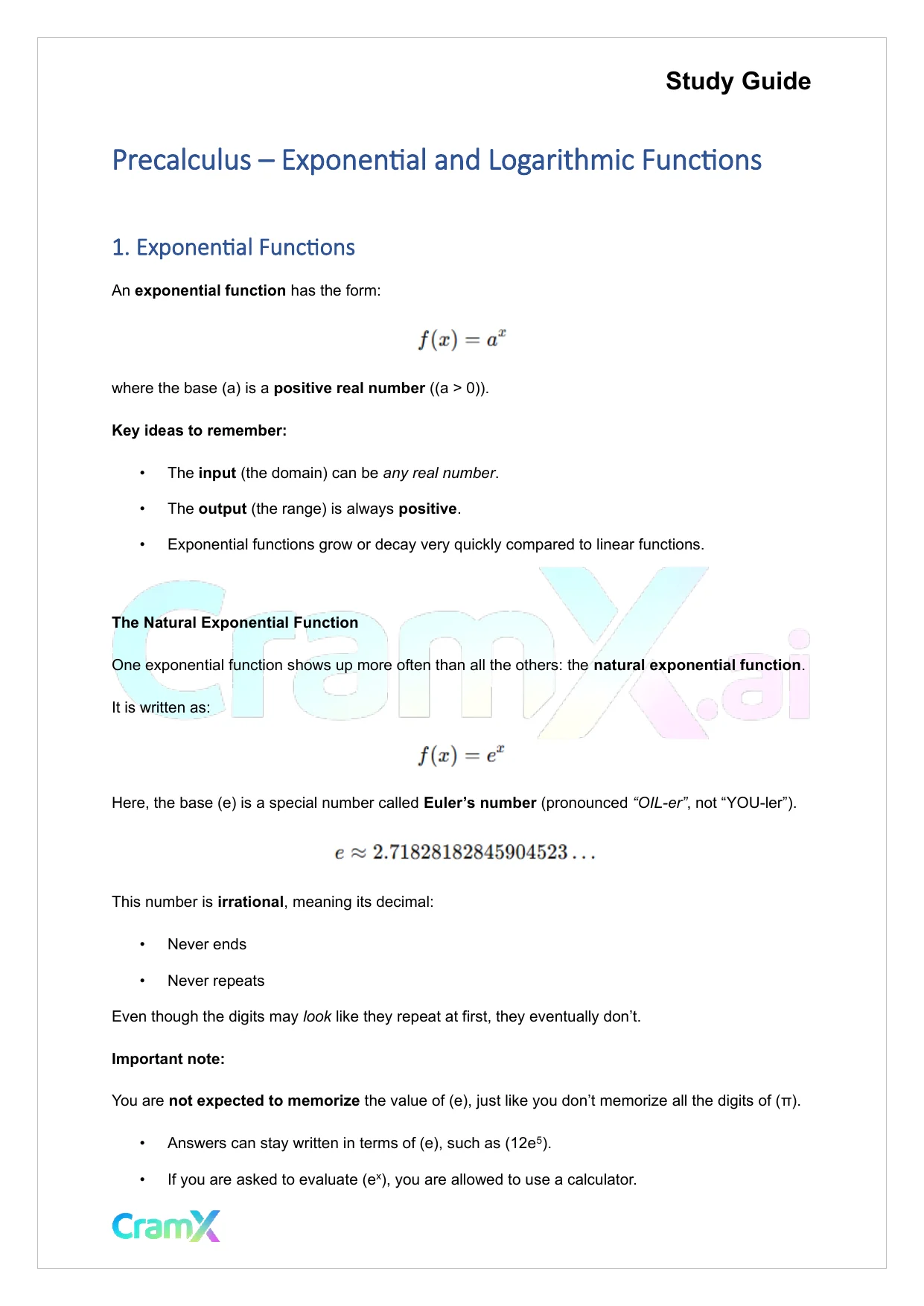 This document provides study materials related to Precalculus - Exponential and Logarithmic Functions. It may include explanations, summarized notes, examples, or practice questions designed to help students understand key concepts and review important topics covered in their coursework.