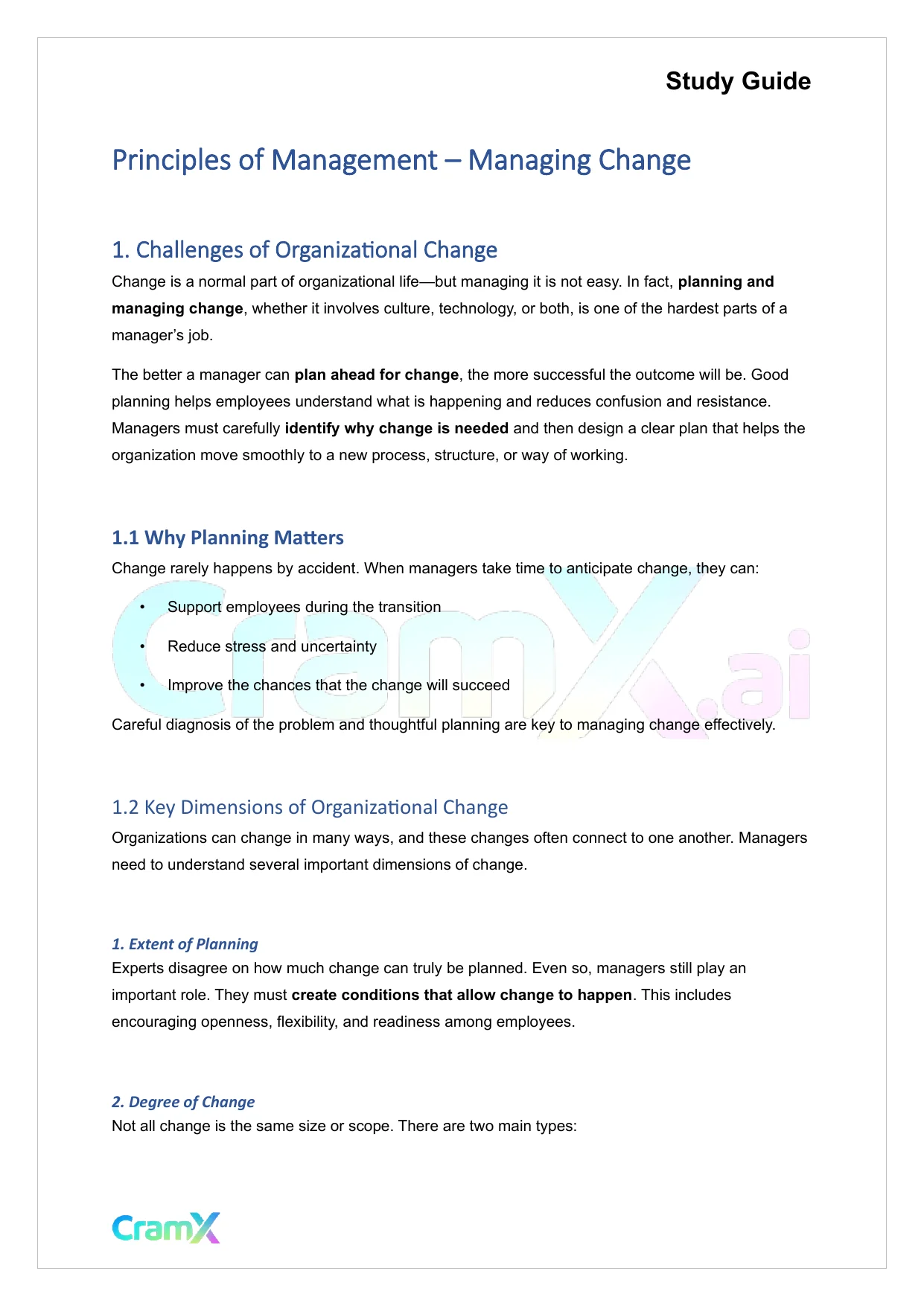 This document provides study materials related to Principles of Management - Managing Change. It may include explanations, summarized notes, examples, or practice questions designed to help students understand key concepts and review important topics covered in their coursework.