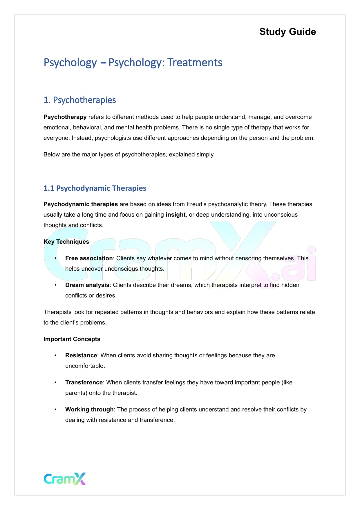 This document provides study materials related to Psychology - Psychology Treatments. It may include explanations, summarized notes, examples, or practice questions designed to help students understand key concepts and review important topics covered in their coursework.