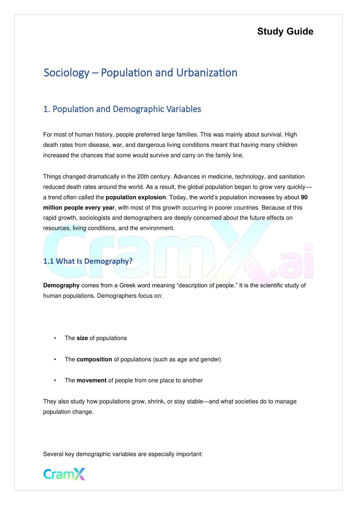 This document provides study materials related to Sociology - Population and Urbanization. It may include explanations, summarized notes, examples, or practice questions designed to help students understand key concepts and review important topics covered in their coursework.