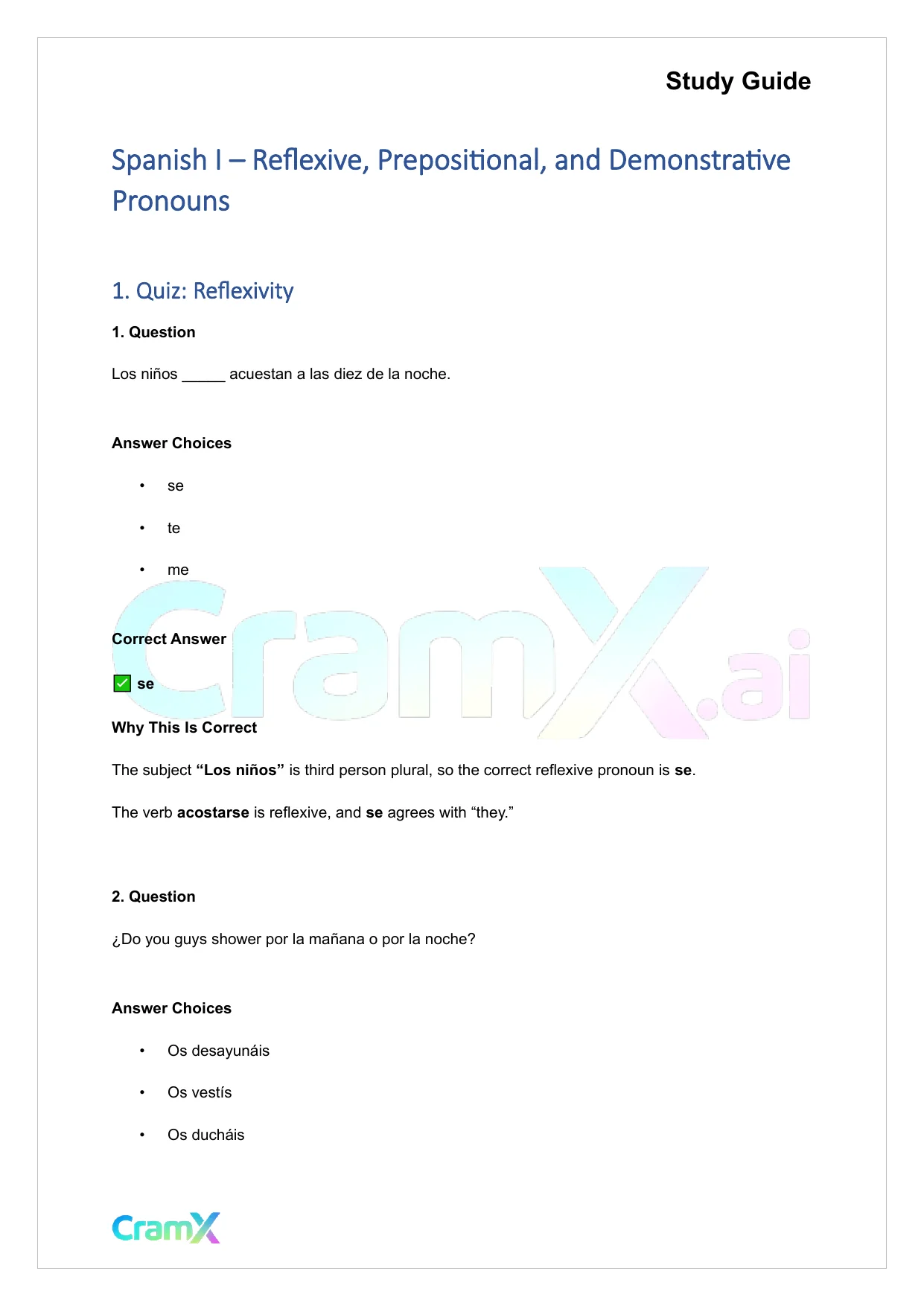 This document provides study materials related to Spanish I - Reflexive, Prepositional, and Demonstrative Pronouns. It may include explanations, summarized notes, examples, or practice questions designed to help students understand key concepts and review important topics covered in their coursework.